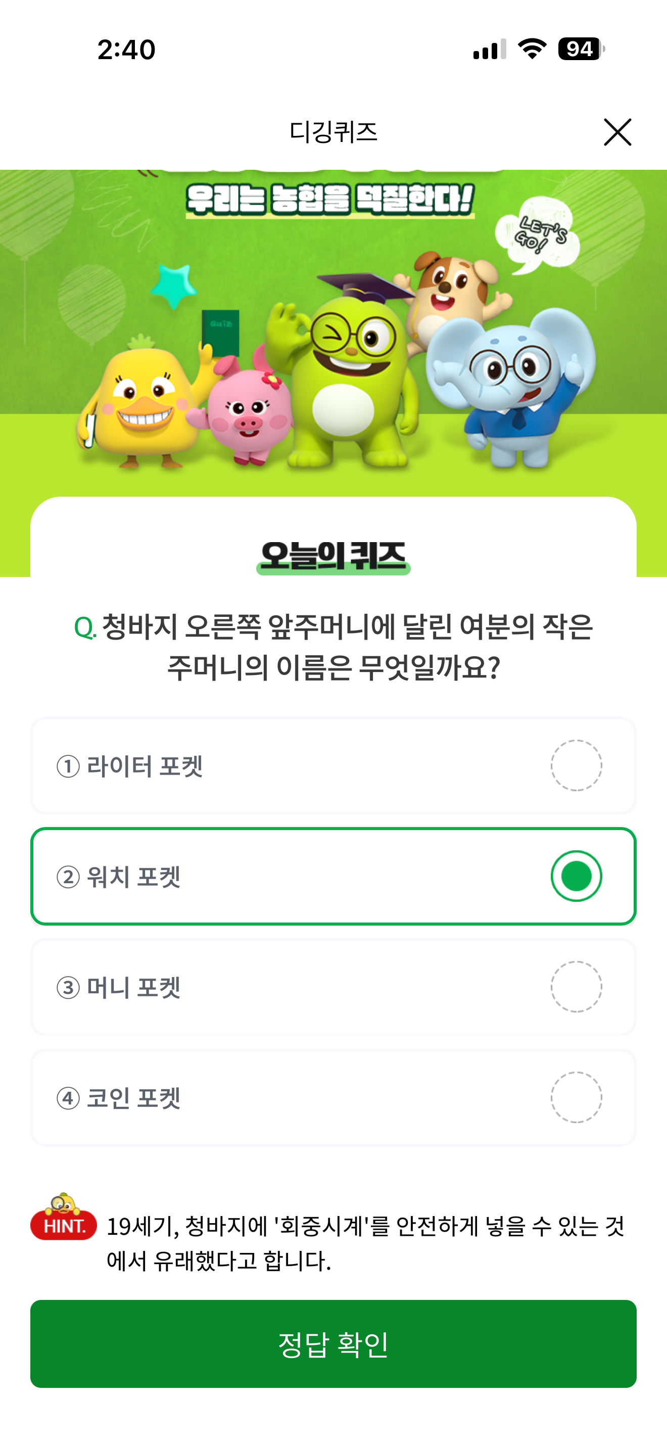 NH올원뱅크 디깅퀴즈 정답은 워치 포켓 입니다