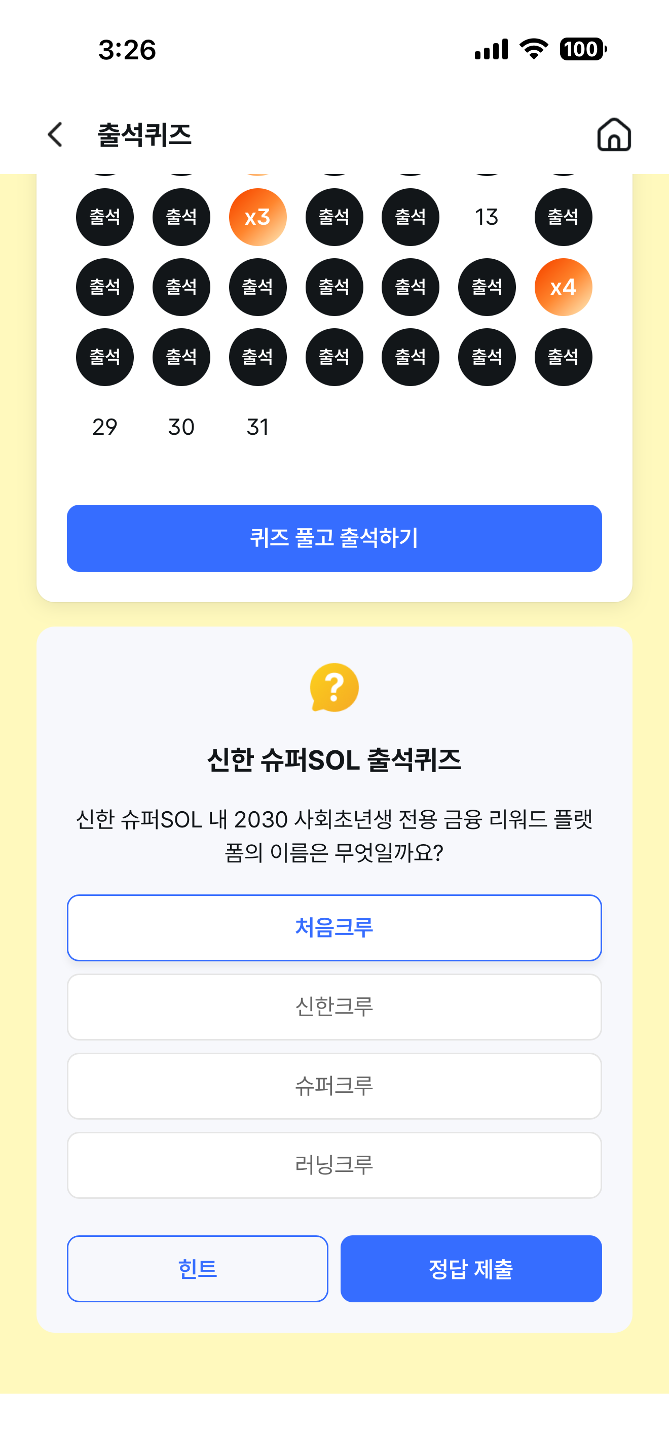신한 슈퍼SOL 출석퀴즈 정답은 처음크루 입니다