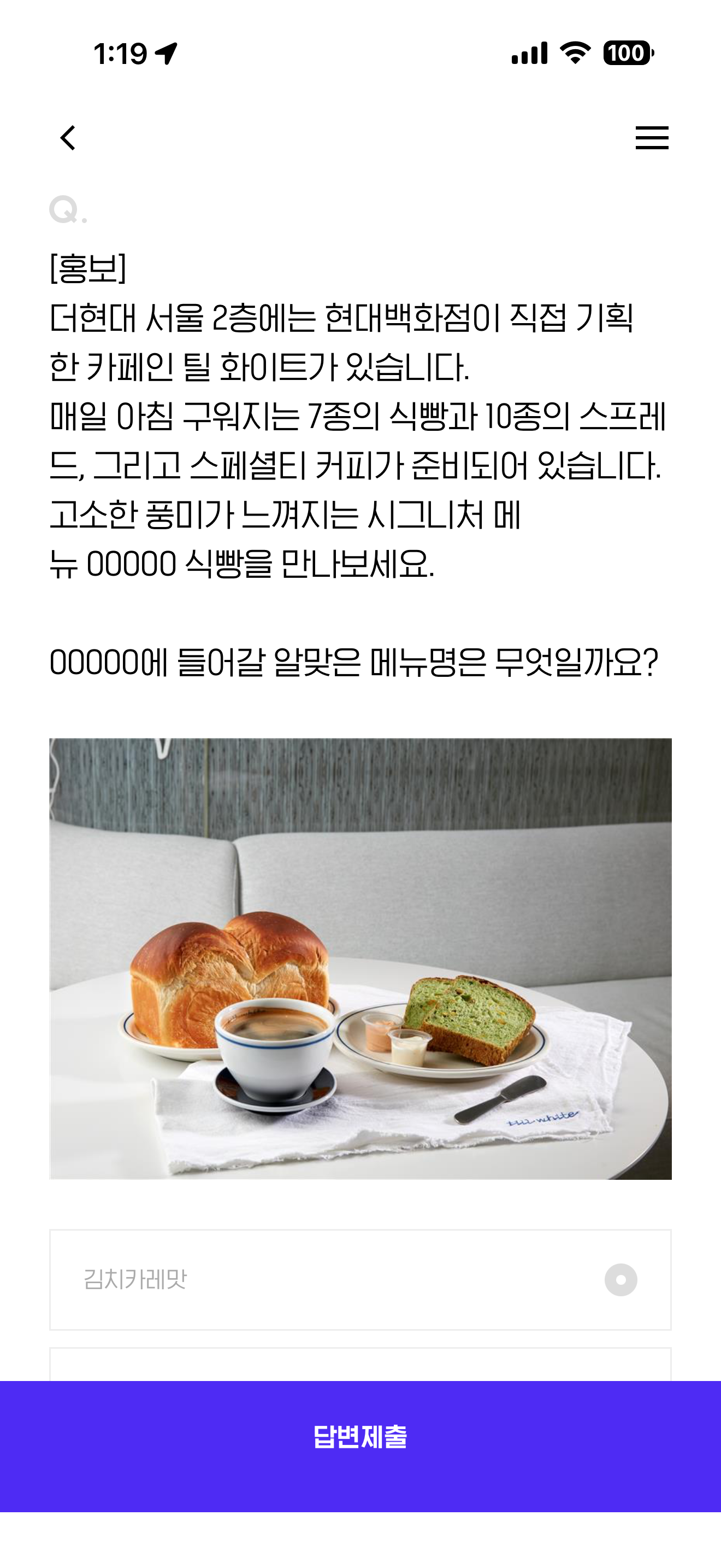 더현대 서울 2층에는 현대백화점이 직접 기획한 카페인 틸 화이트가 있습니다. 매일 아침 구워지는 7종의 식빵과 10종의 스프레드, 그리고 스페셜티 커피가 준비되어 있습니다. 고소한 풍미가 느껴지는 시그니처 메뉴 00000 식빵을 만나보세요 00000에 들어갈 알맞은 메뉴명은 무엇일까요?