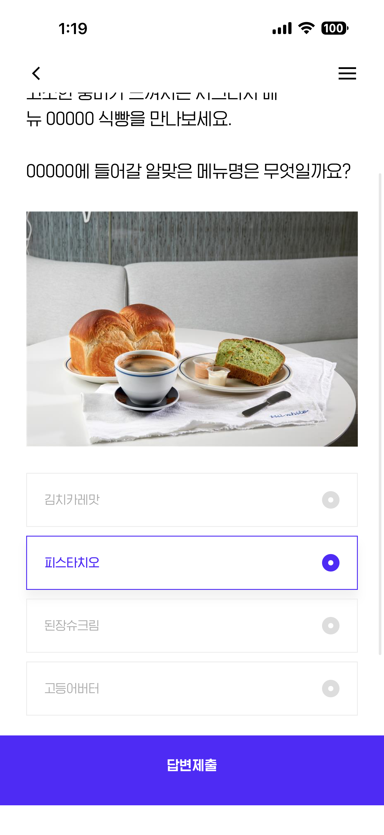 더현대 서울 2층에는 현대백화점이 직접 기획한 카페인 틸 화이트가 있습니다. 매일 아침 구워지는 7종의 식빵과 10종의 스프레드, 그리고 스페셜티 커피가 준비되어 있습니다. 고소한 풍미가 느껴지는 시그니처 메뉴 00000 식빵을 만나보세요 00000에 들어갈 알맞은 메뉴명은 무엇일까요?