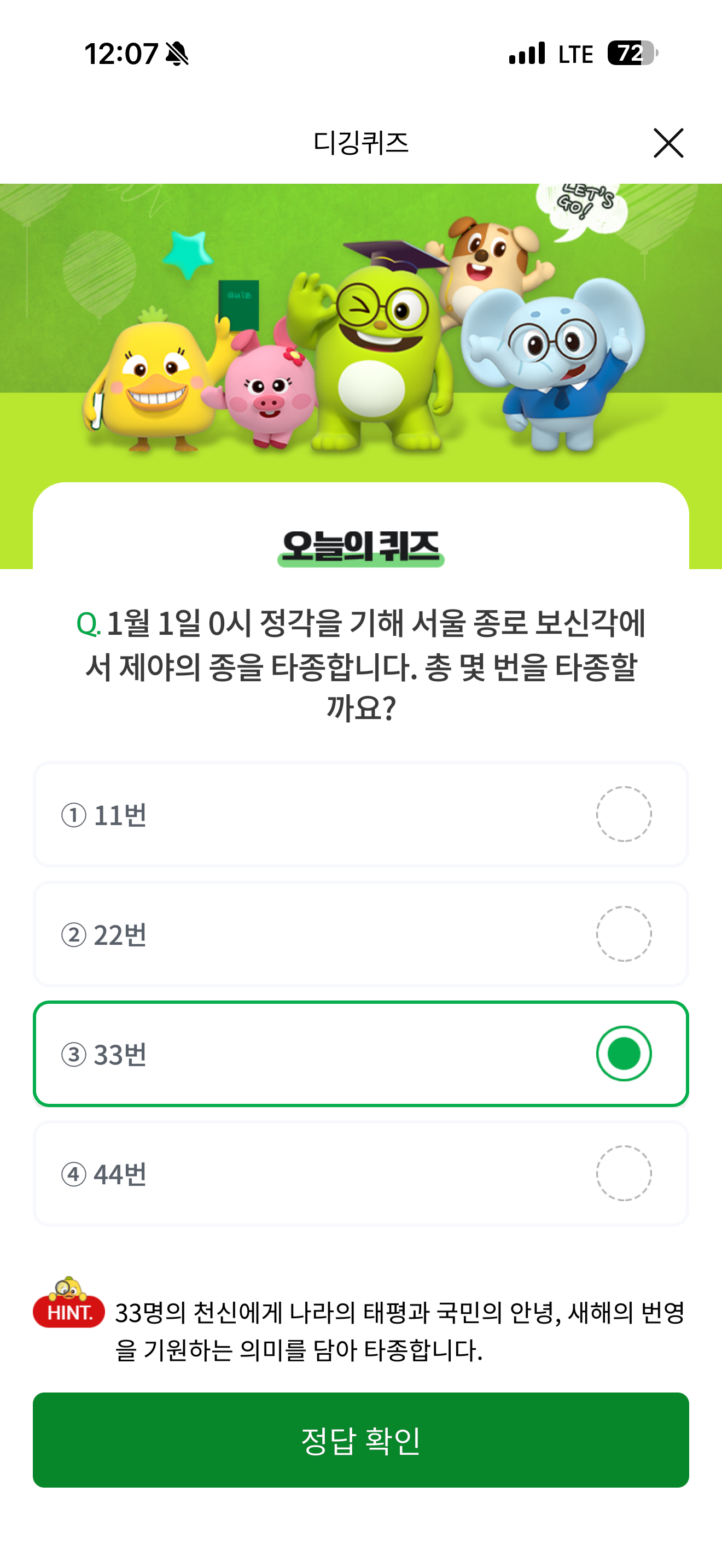 NH올원뱅크 디깅퀴즈 1월 1일 정답(1월 1일 0시 정각을 기해 서울 종로 보신각에서 제야의 종을 타종합니다. 총 몇 번을 타종할까요?)