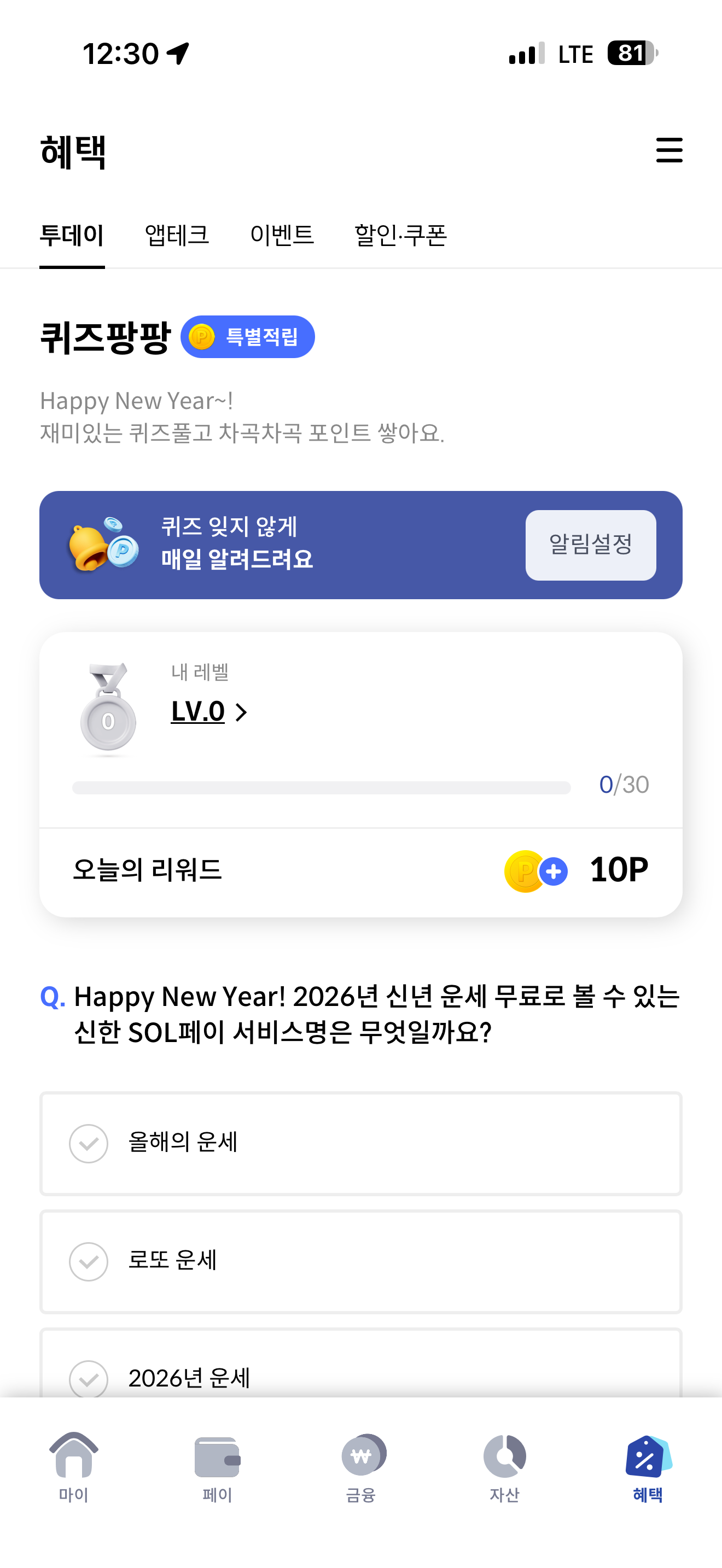 신한카드 퀴즈팡팡 1월 1일 정답(Happy New Year! 2026년 신년 운세 무료로 볼 수 있는 신한 SOL페이 서비스명은 무엇일까요?)
