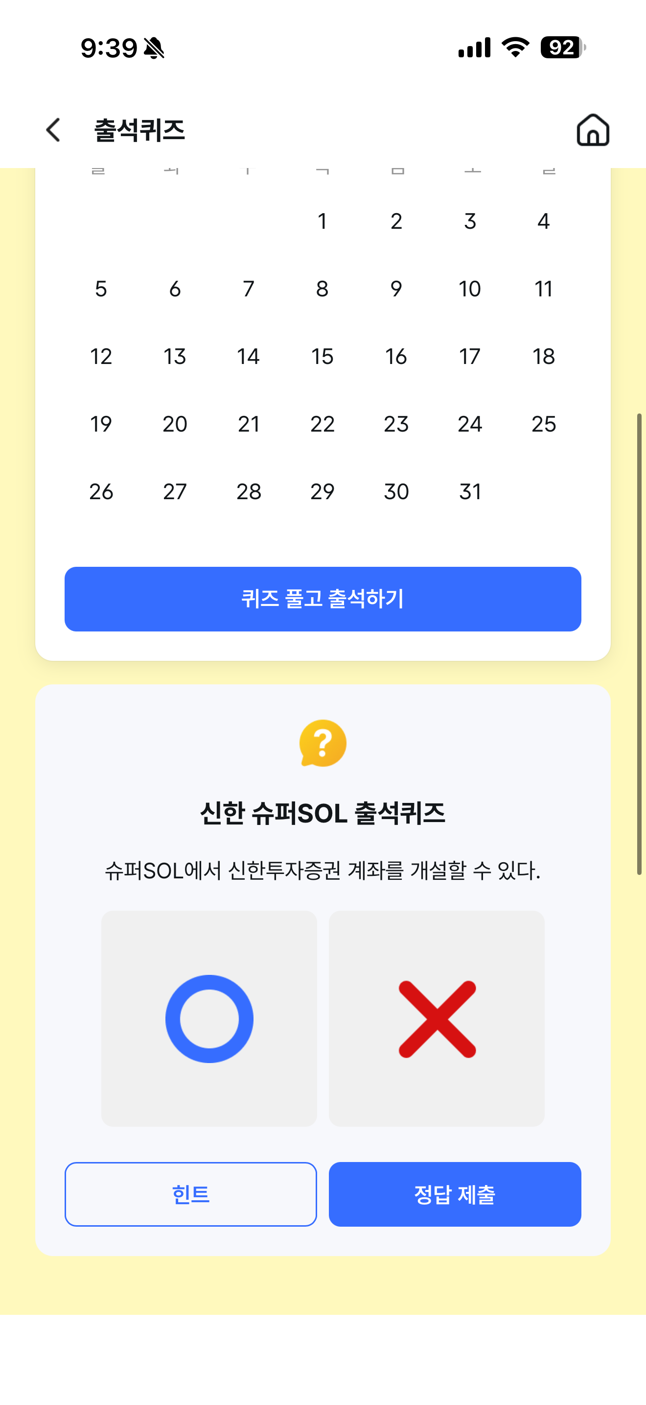 신한 슈퍼SOL 출석퀴즈 정답은 O 입니다