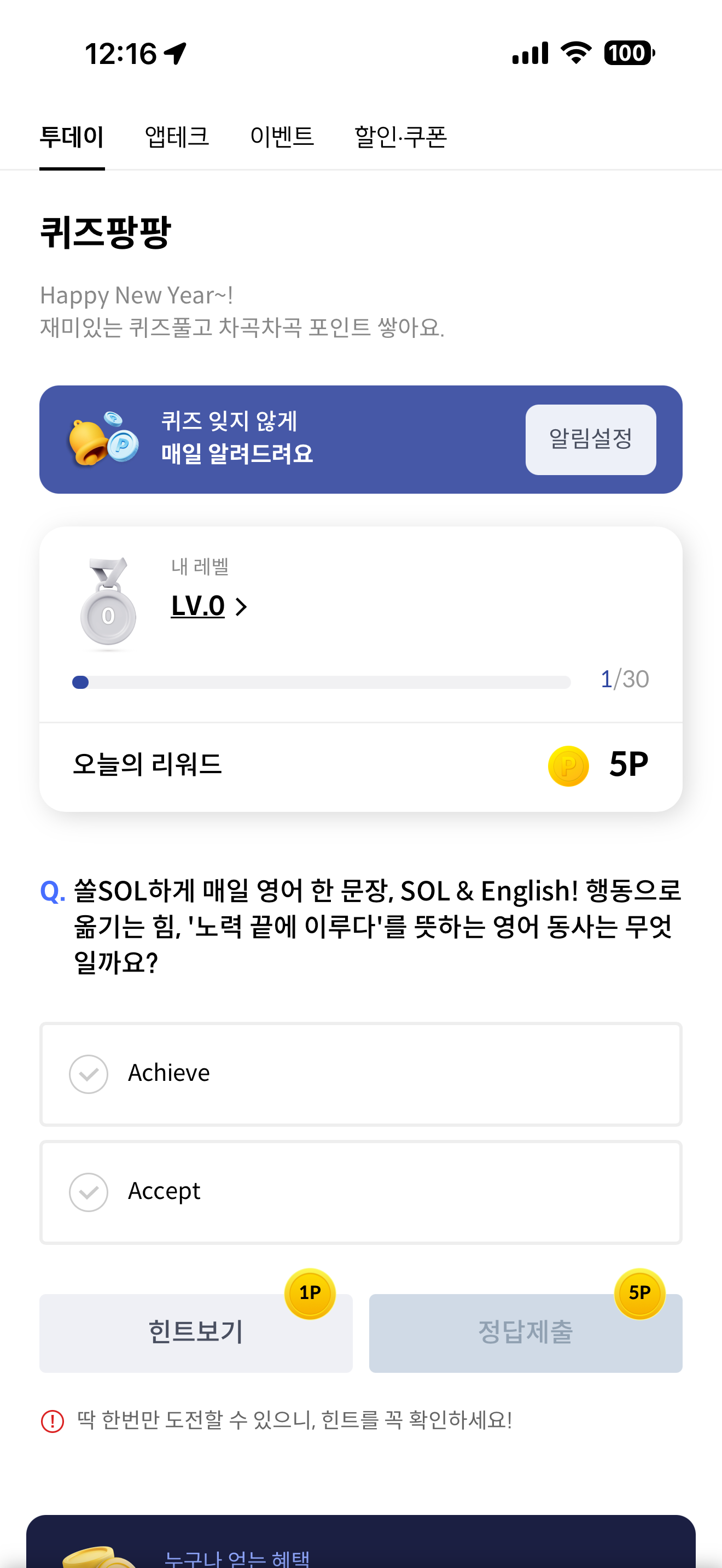 신한카드 퀴즈팡팡 정답은 Achieve 입니다