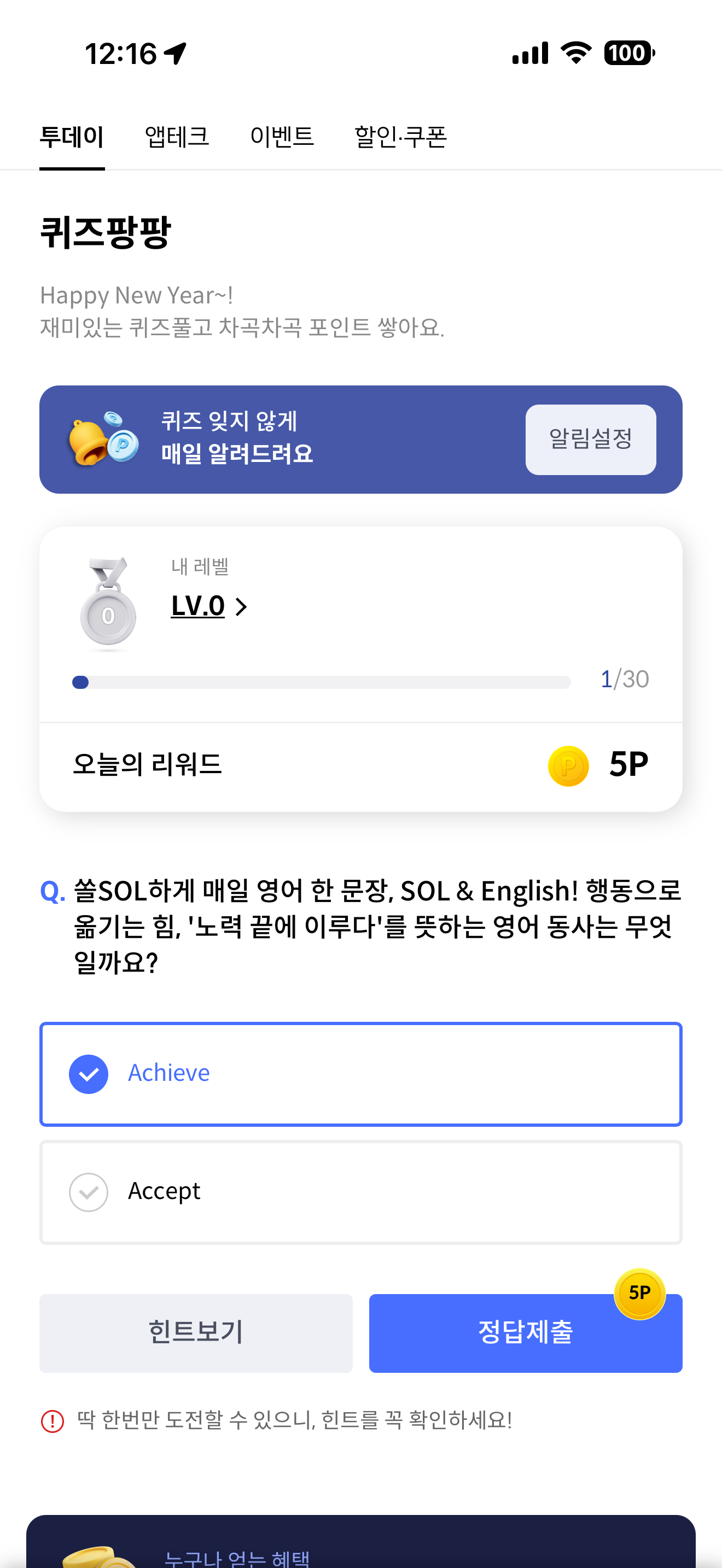 쏠SOL하게 매일 영어 한 문장, SOL & English! 행동으로 옮기는 힘, '노력 끝에 이루다'를 뜻하는 영어 동사는 무엇일까요? 보기는 1. Achieve 2. Accept 입니다. 노력 끝에 이루다를 뜻하는 영어 동사 잘 참고해 두세요