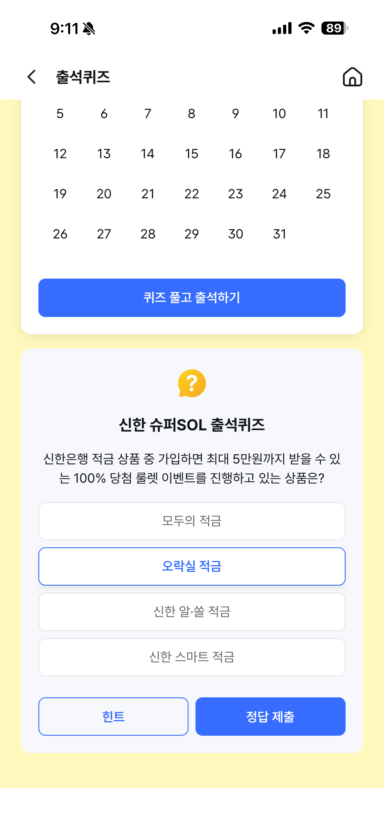 신한 슈퍼SOL 출석퀴즈 정답은 오락실 적금 입니다