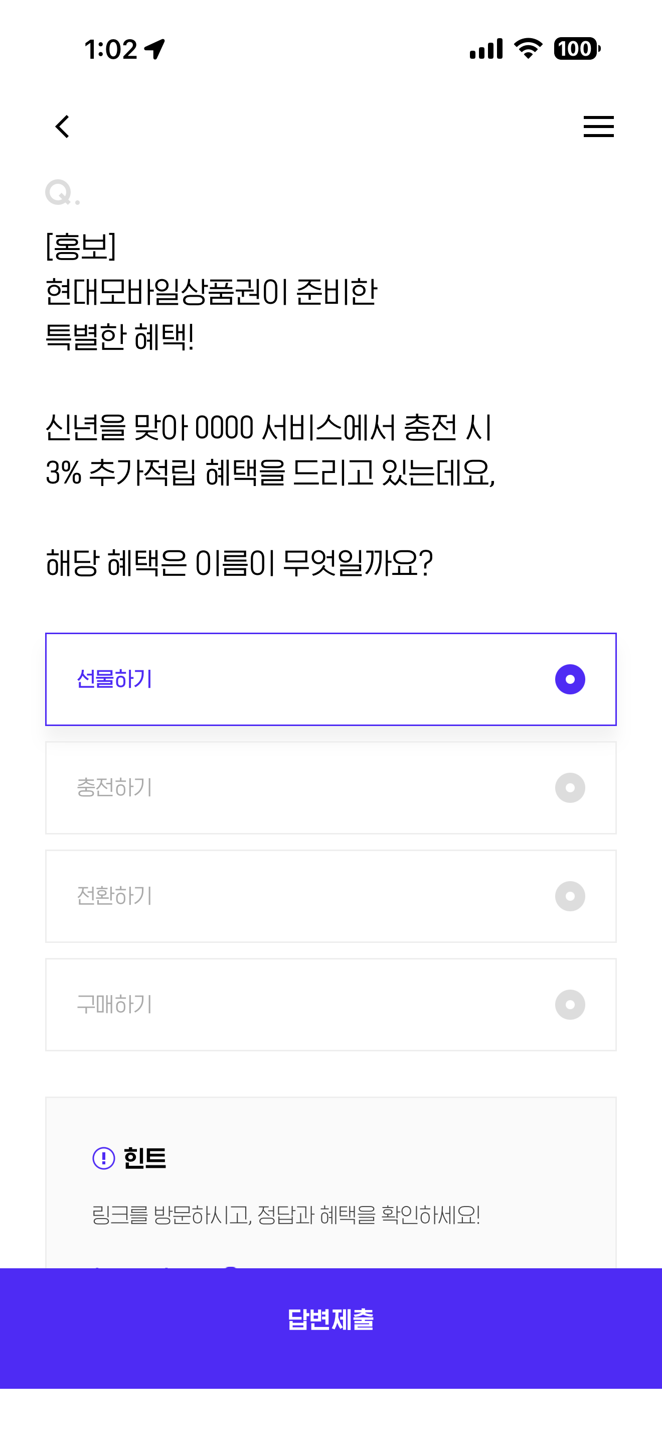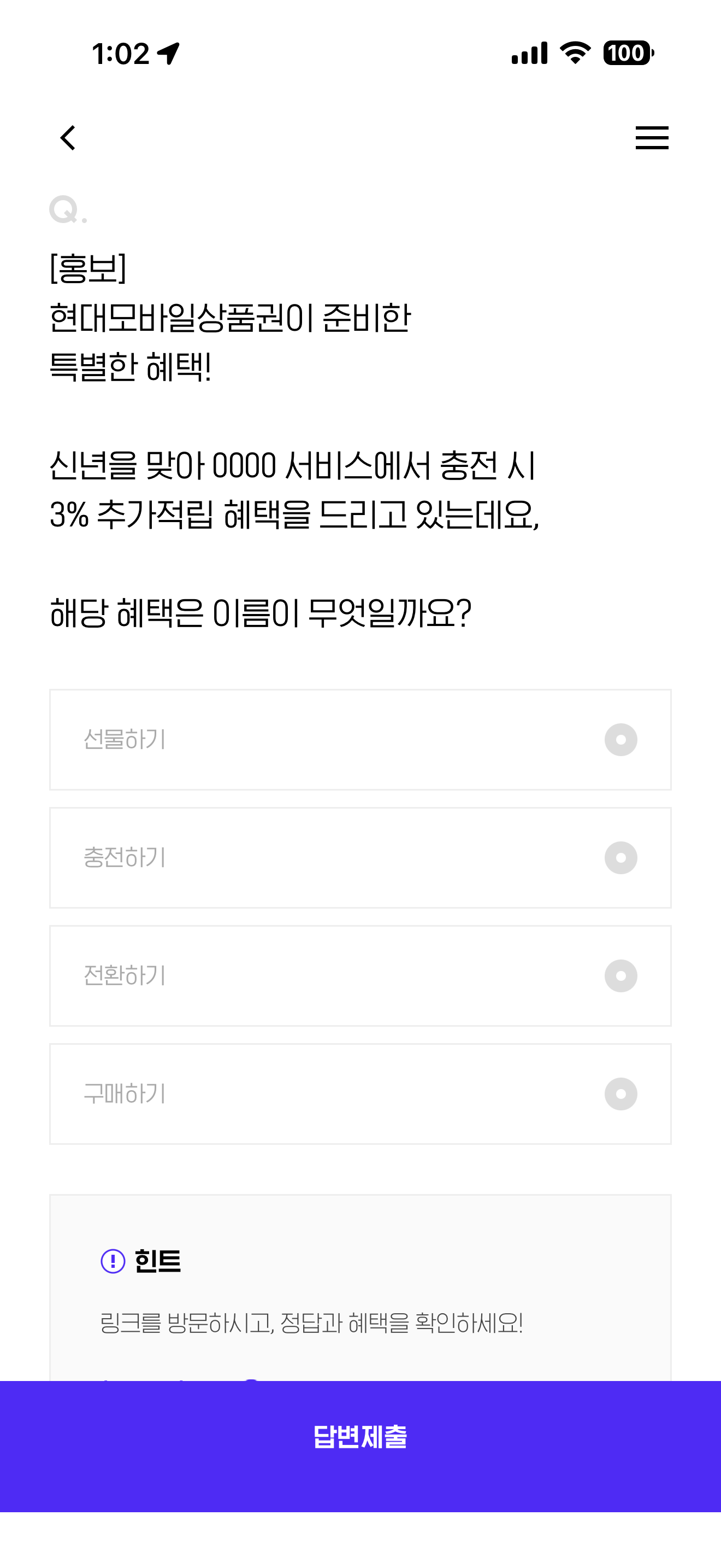 현대모바일상품권이 준비한 특별한 혜택! 신년을 맞아 0000 서비스에서 충전 시 3% 추가적립 혜택을 드리고 있는데요, 해당 혜택은 이름은 무엇일까요? 보기는 1. 선물하기 2. 충전하기 3. 전환하기 4. 구매하기 입니다.