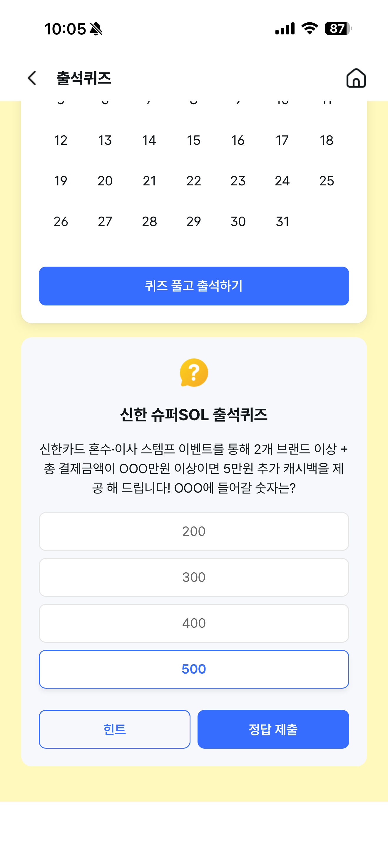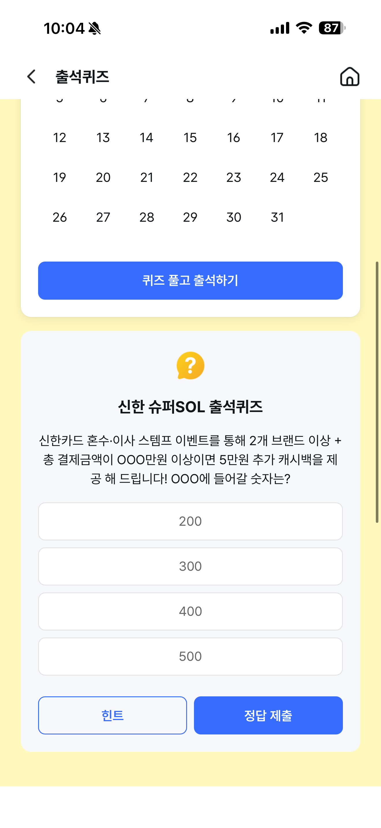 신한 슈퍼SOL 출석퀴즈 정답은 500 입니다