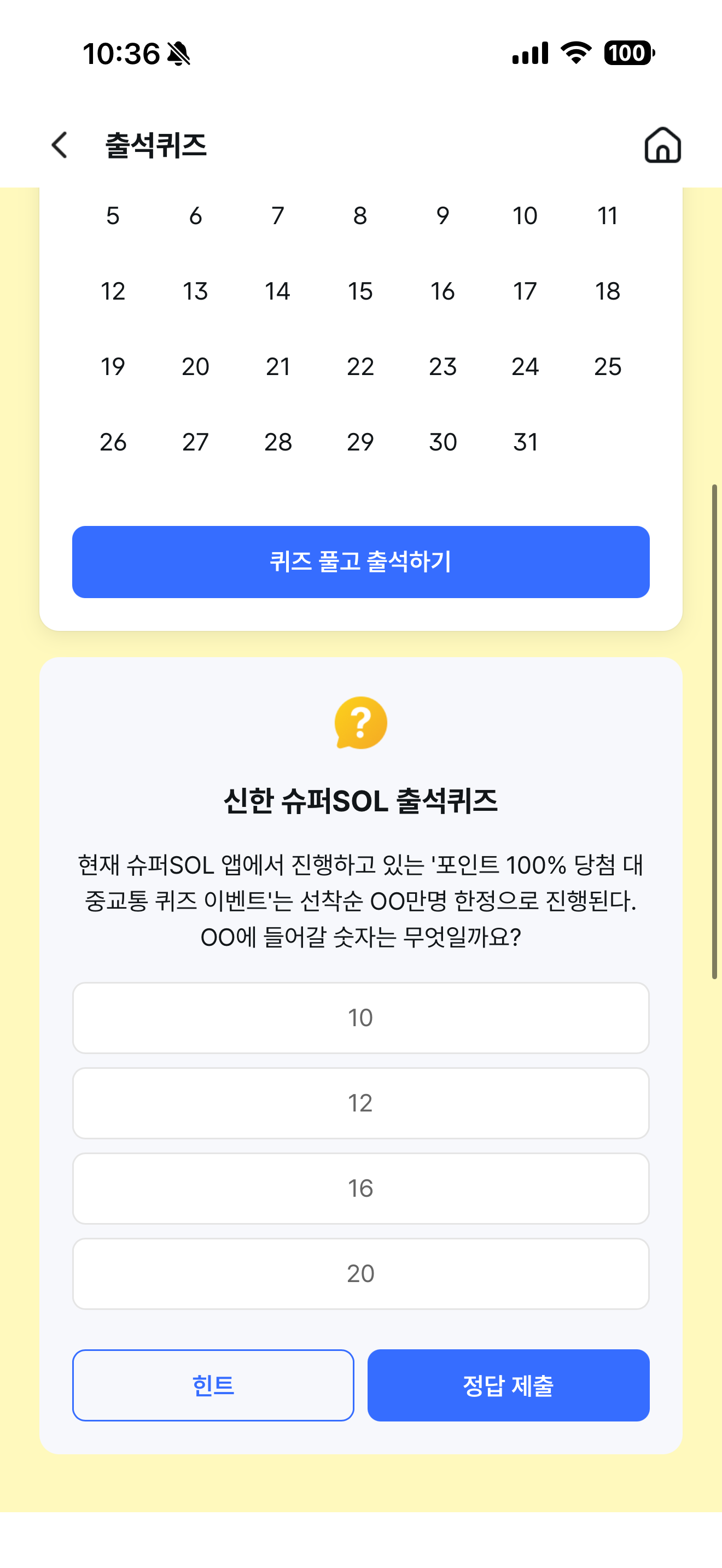 현재 슈퍼SOL 앱에서 진행하고 있는 '포인트 100% 당첨 대중교통 퀴즈 이벤트'는 선착순 OO만명 한정으로 진행된다. OO에 들어갈 숫자는 무엇일까요? 보기는 1. 10 2. 12 3. 16 4. 20 입니다.