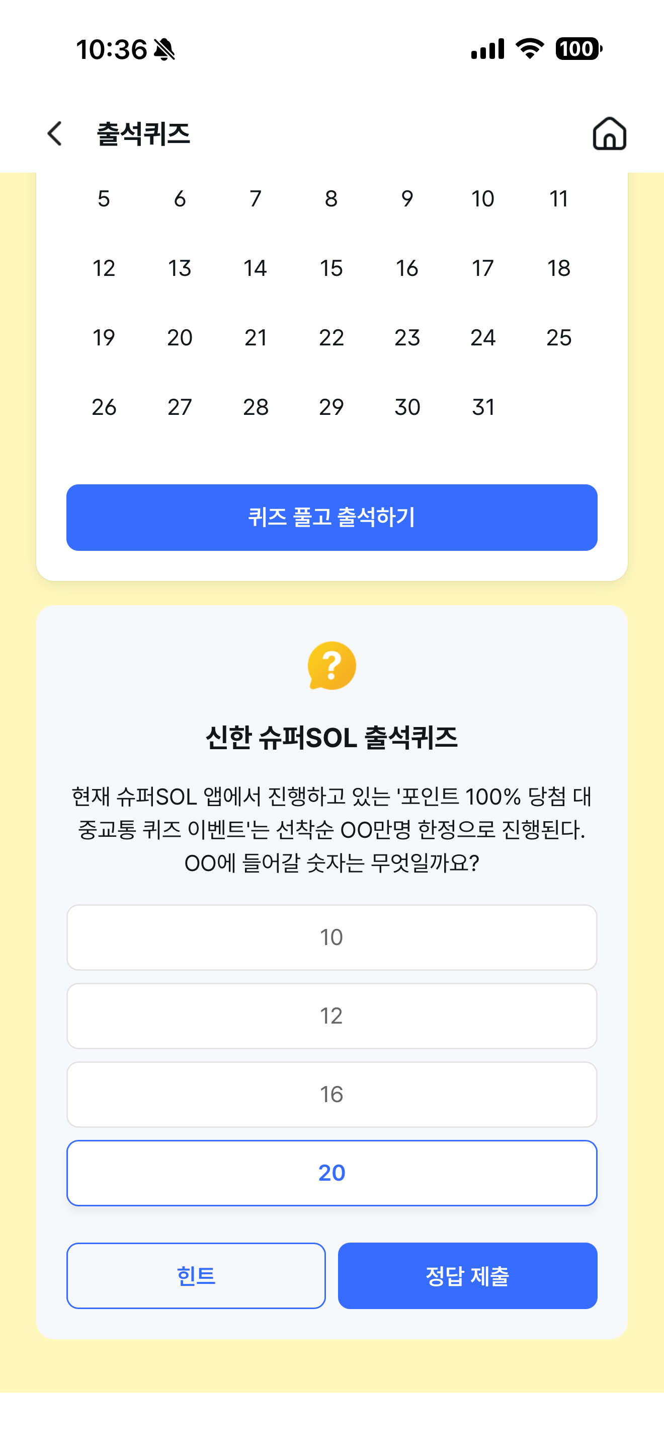 신한 슈퍼SOL 출석퀴즈 정답은 20 입니다