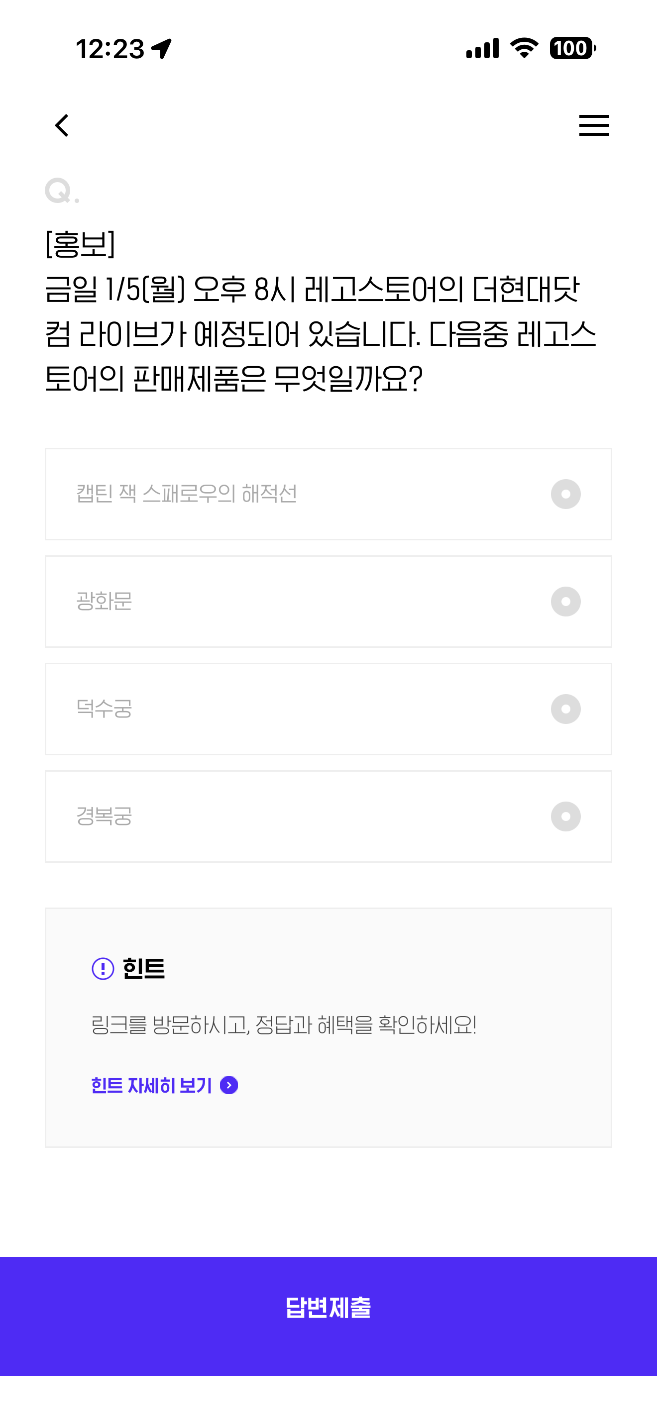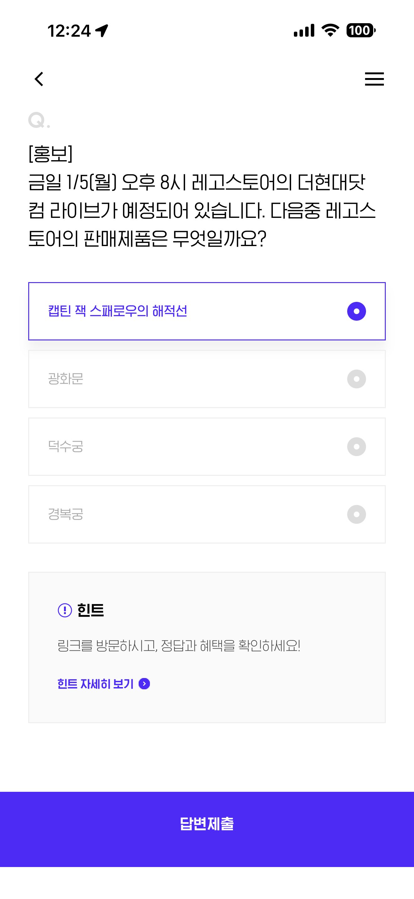 금일 1/5(월) 오후 8시 레고스토어의 더현대닷컴 라이브가 예정되어 있습니다. 다음중 레고스토어의 판매제품은 무엇일까요? 보기는 1. 캡틴 잭 스패로우의 해적선 2. 광화문 3. 덕수궁 4. 경복궁 입니다.