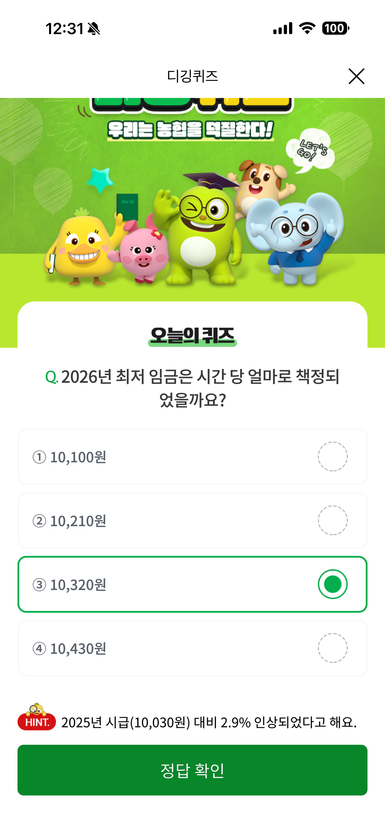 2026년 최저 임금은 시간 당 얼마로 책정되었을까요? 보기는 1. 10,100원 2. 10,210원 3. 10,320원 4. 10,430원 입니다. 2025년 시급은 10,030원이었습니다. 2.9% 인상되었으니 어떤 건지 답이 보이죠