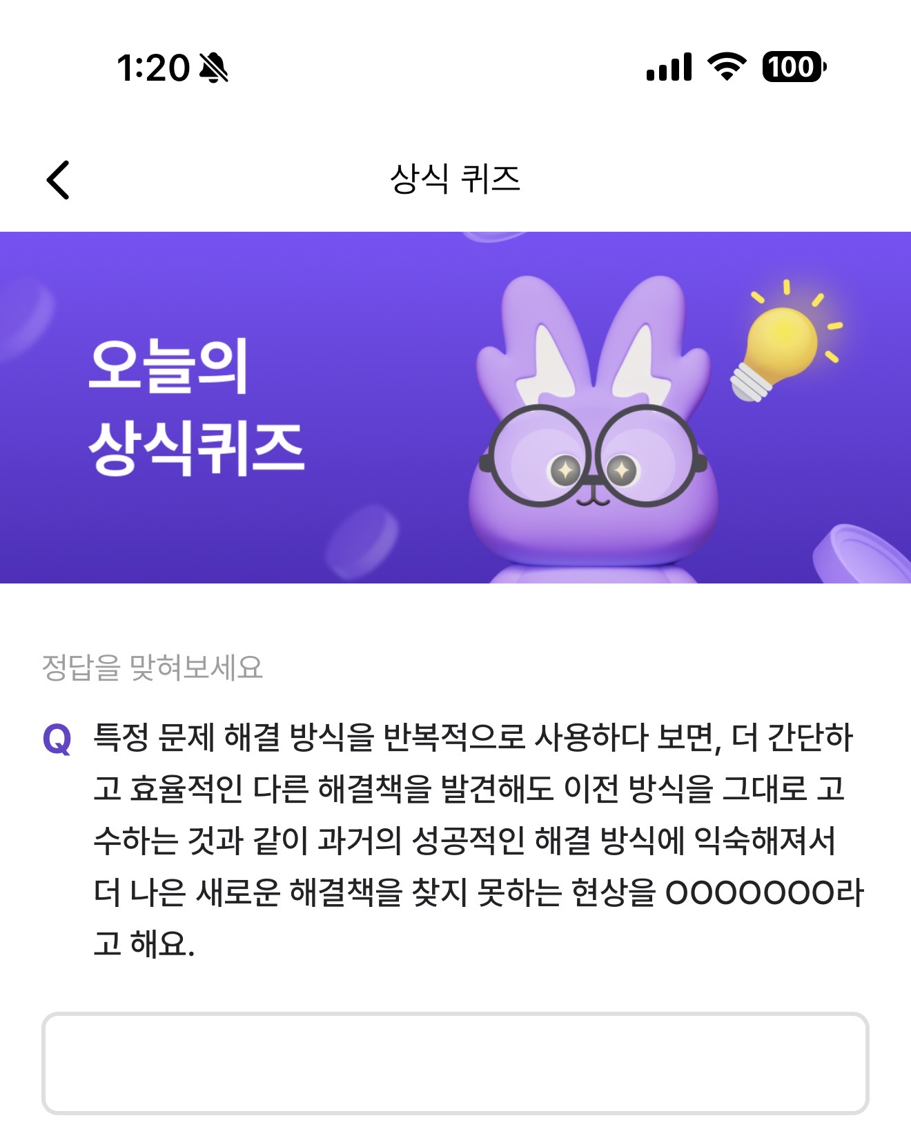 특정 문제 해결 방식을 반복적으로 사용하다 보면, 더 간단하고 효율적인 다른 해결책을 발견해도 이전 방식을 그대로 고수하는 것과 같이 과거의 성공적인 해결 방식에 익숙해져서 더 나은 새로운 해결책을 찾지 못하는 현상을 OOOOOO라고 해요. 주관식 퀴즈인데요.