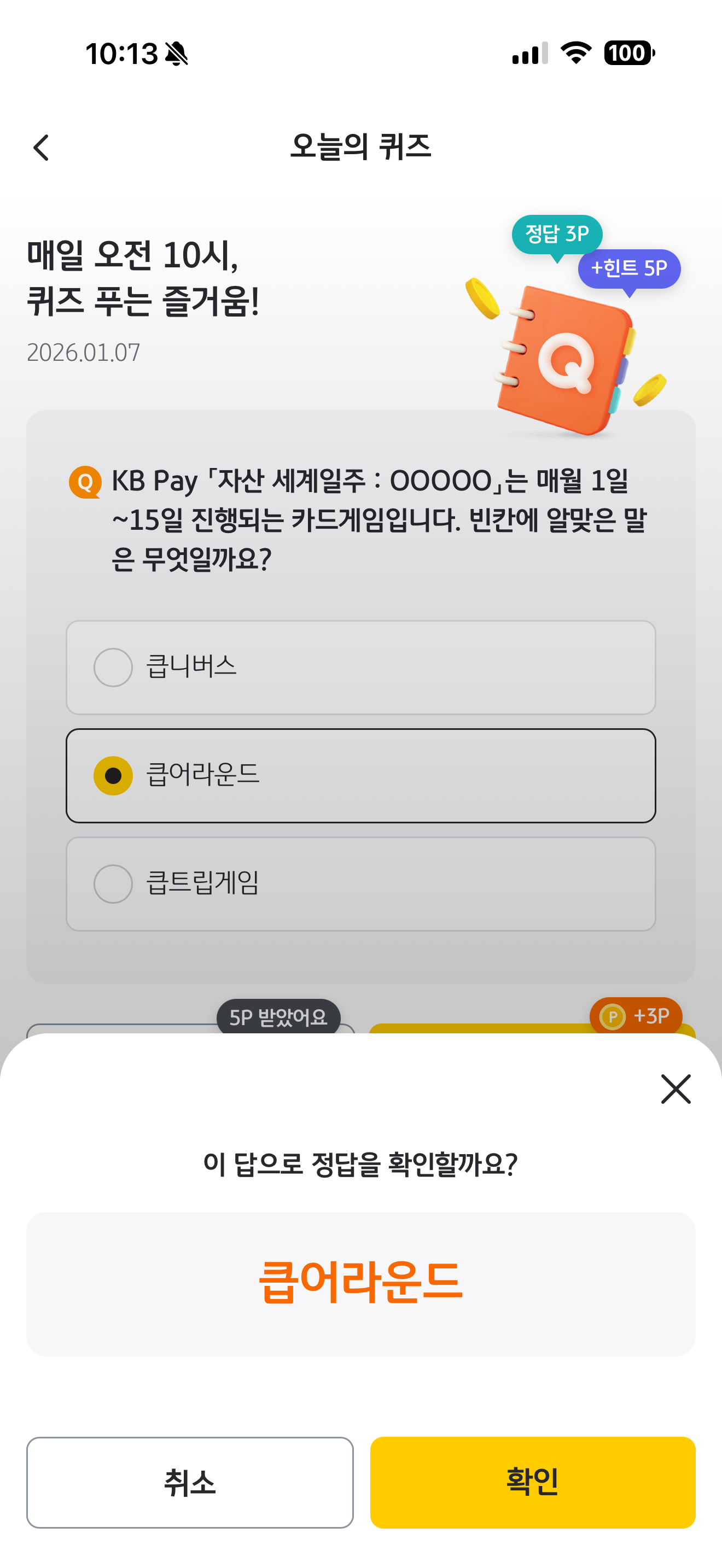 KB Pay 오늘의 퀴즈 정답은 큽어라운드 입니다