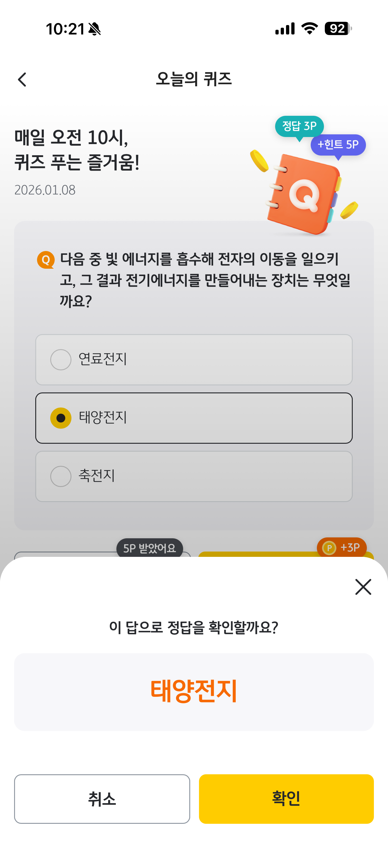 KB Pay 오늘의 퀴즈 정답은 태양전지 입니다