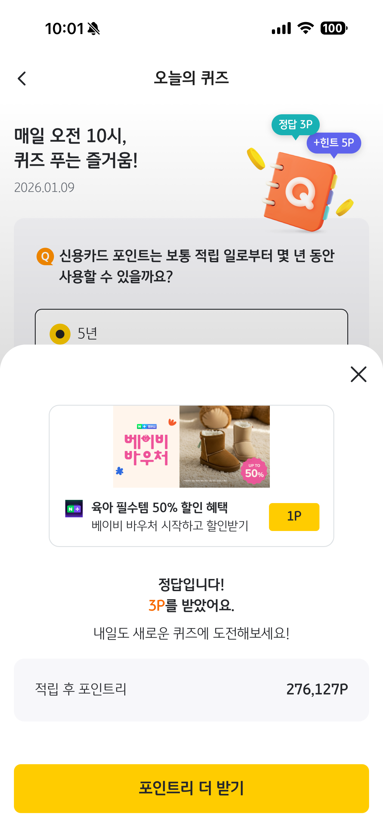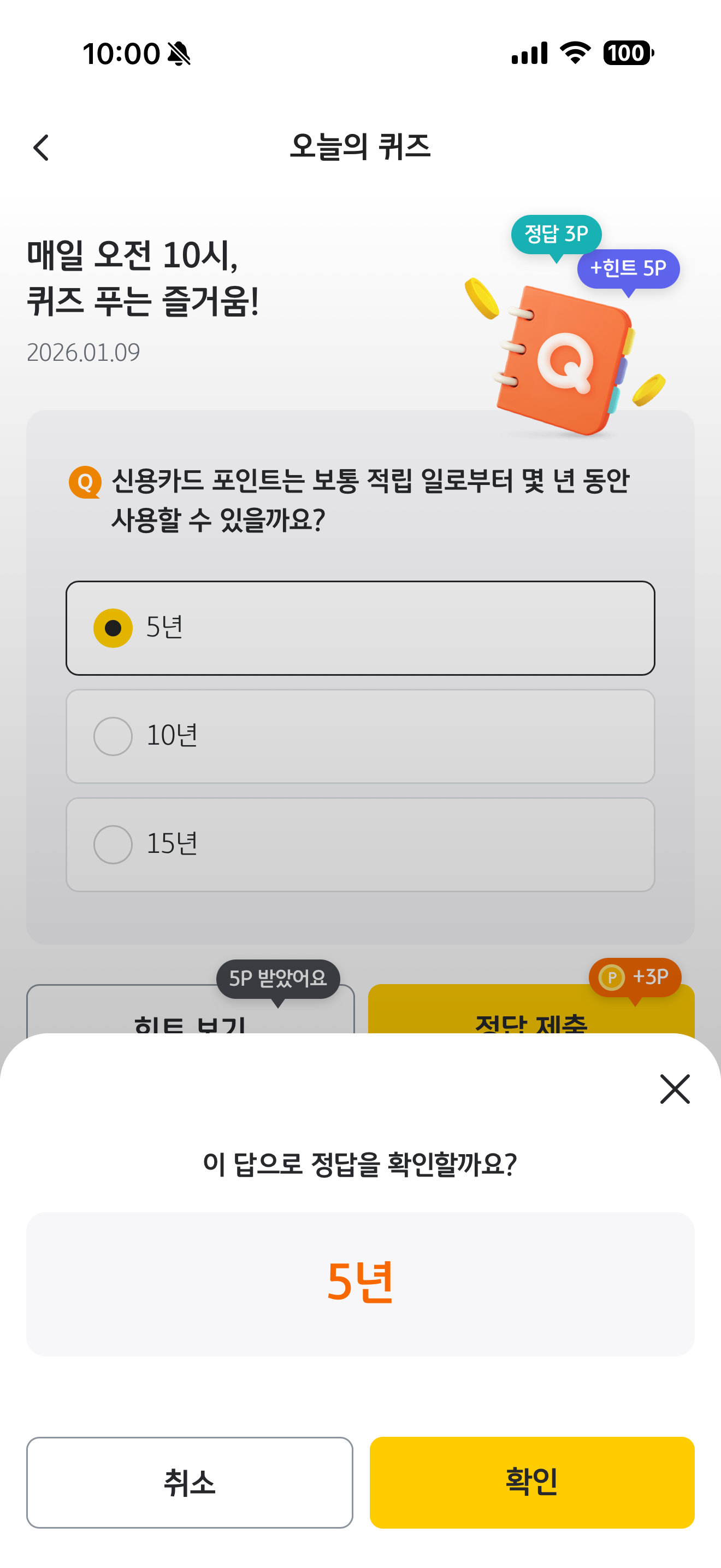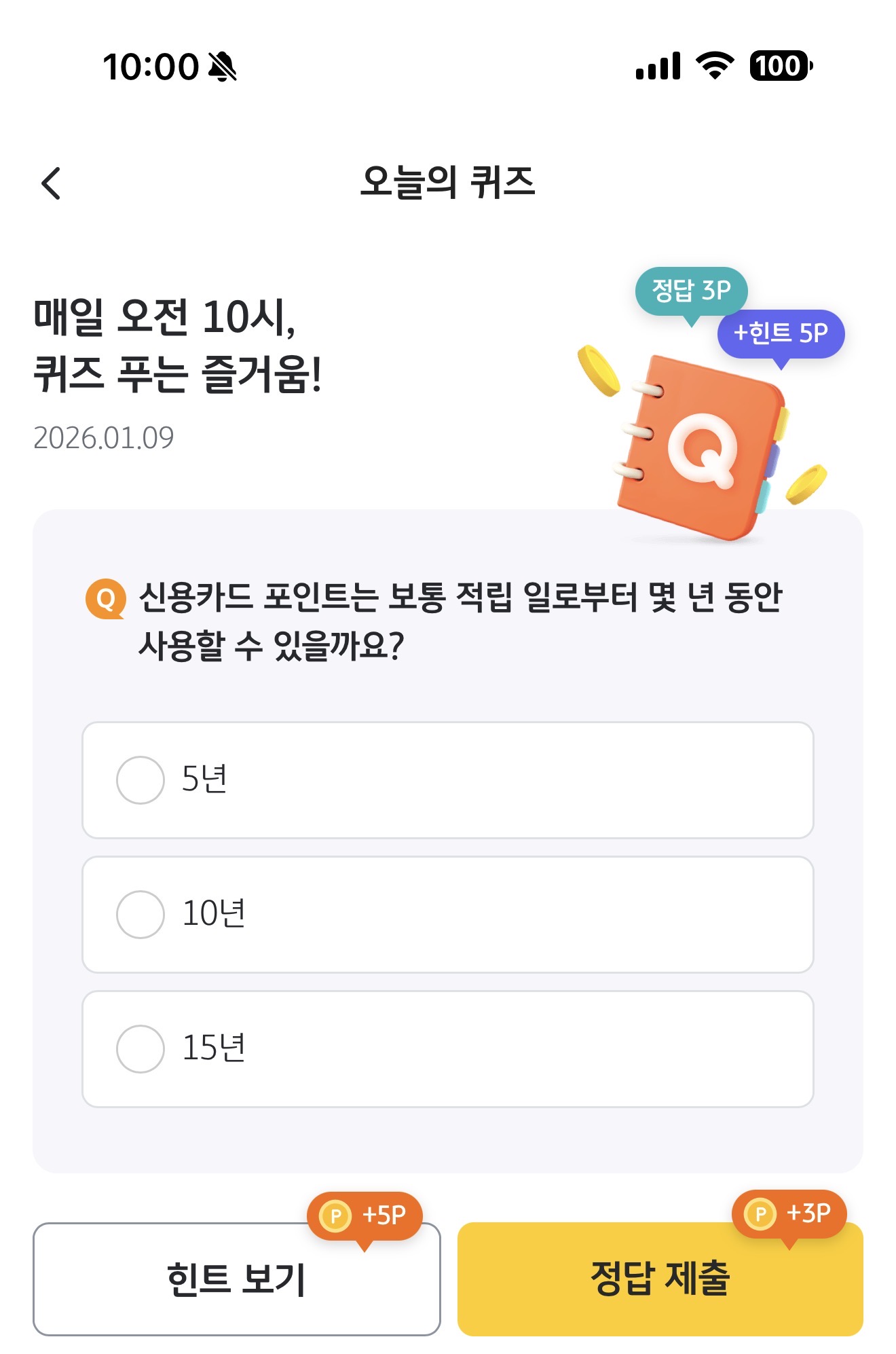 KB Pay 오늘의 퀴즈 1월 9일 정답(신용카드 포인트는 보통 적립 일로부터 몇 년 동안 사용할 수 있을까요?)
