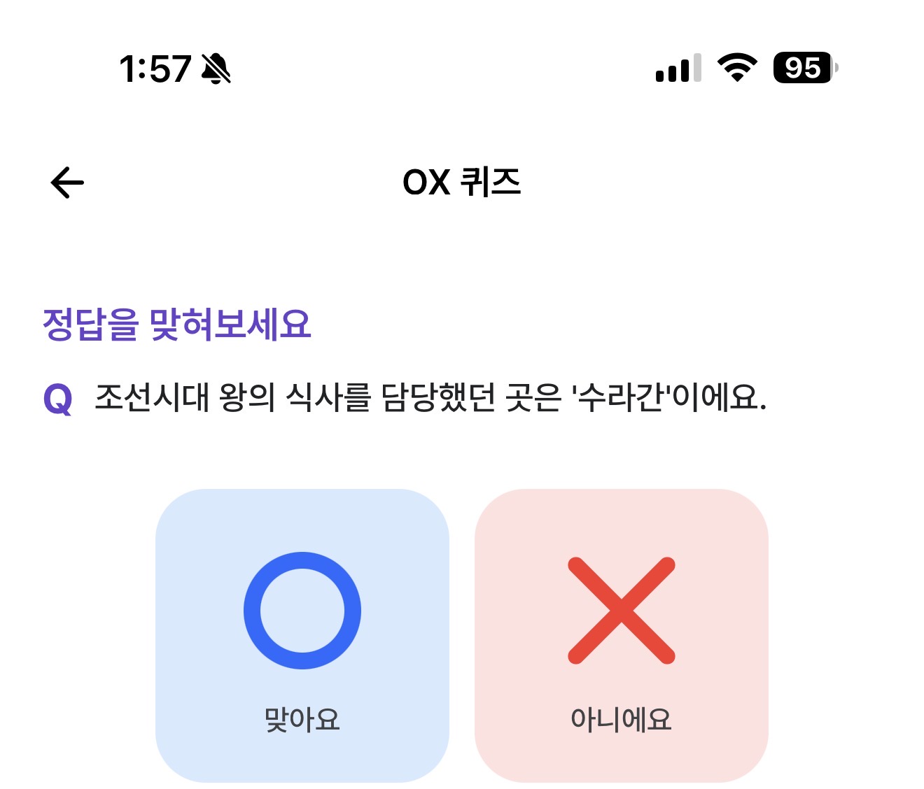 조선시대 왕의 식사를 담당했던 곳은 '수라간'이에요 O, X 퀴즈인데요. 조선시대는 왕의 식사를 담당했던 유명한 곳이 있죠. 드라마에서도 많이 봤고 그 유명한 대장금의 배경이 되었던 곳이죠.
