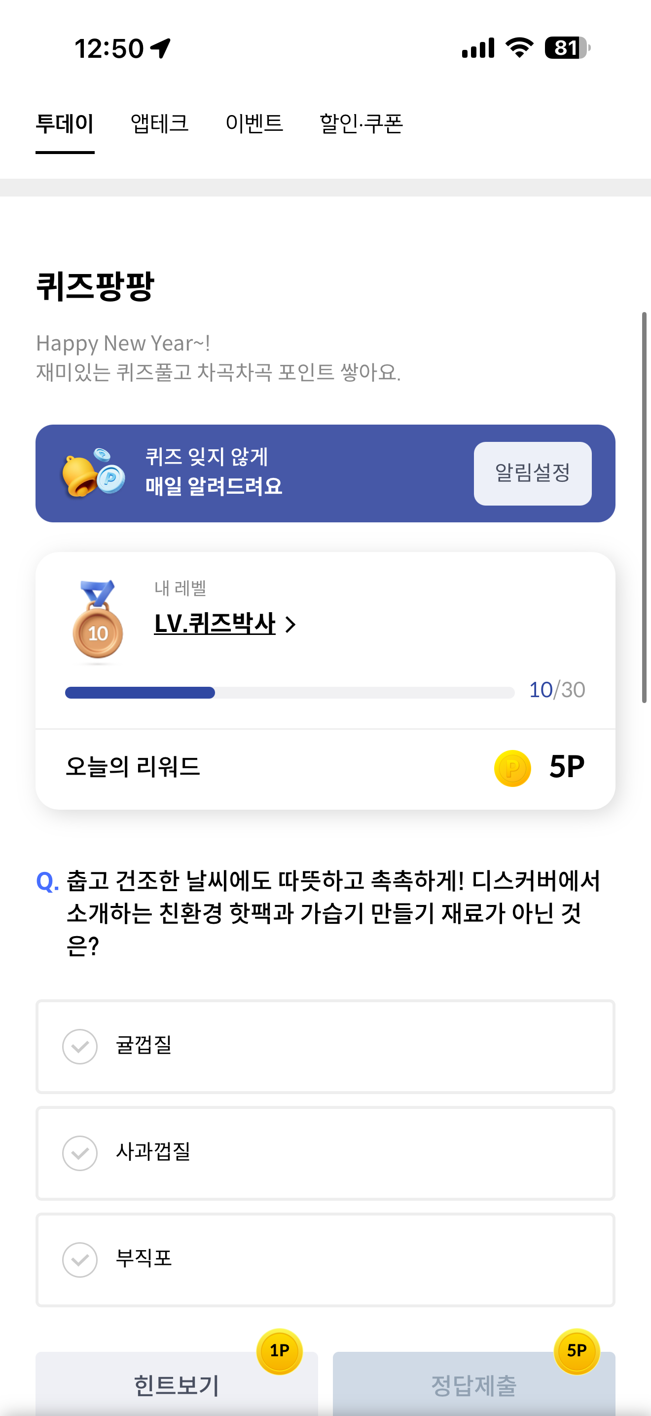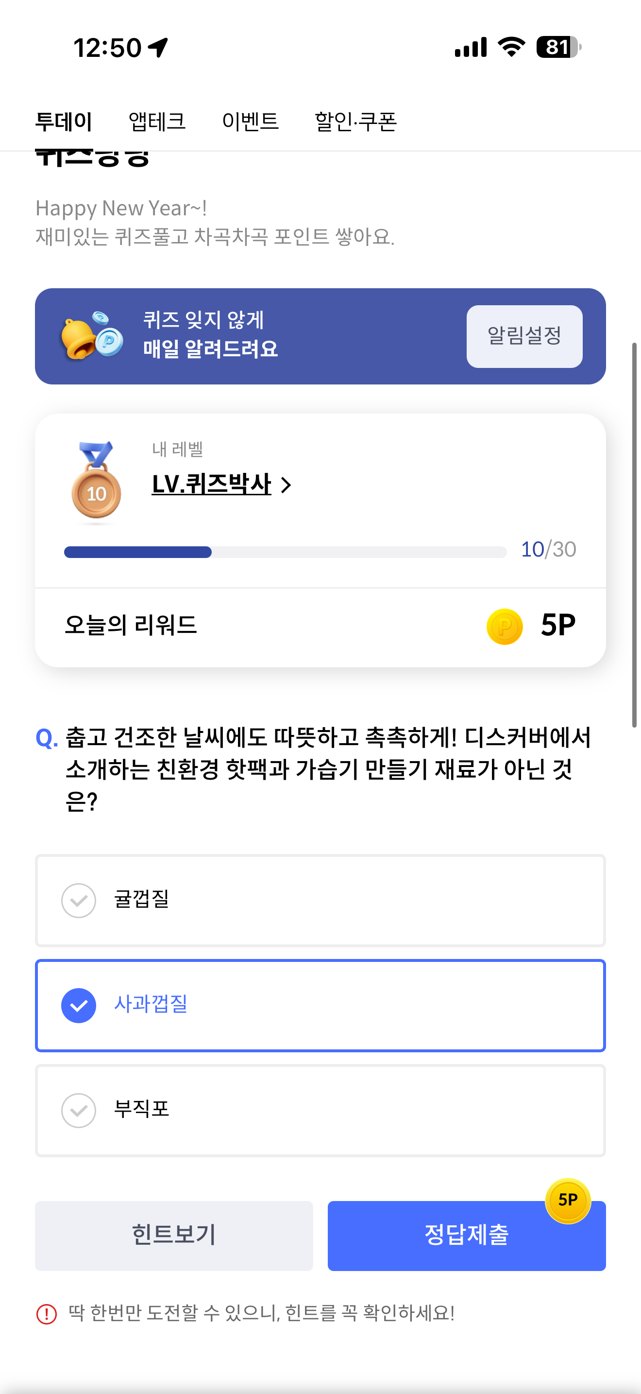 신한카드 퀴즈팡팡 정답은 사과껍질 입니다