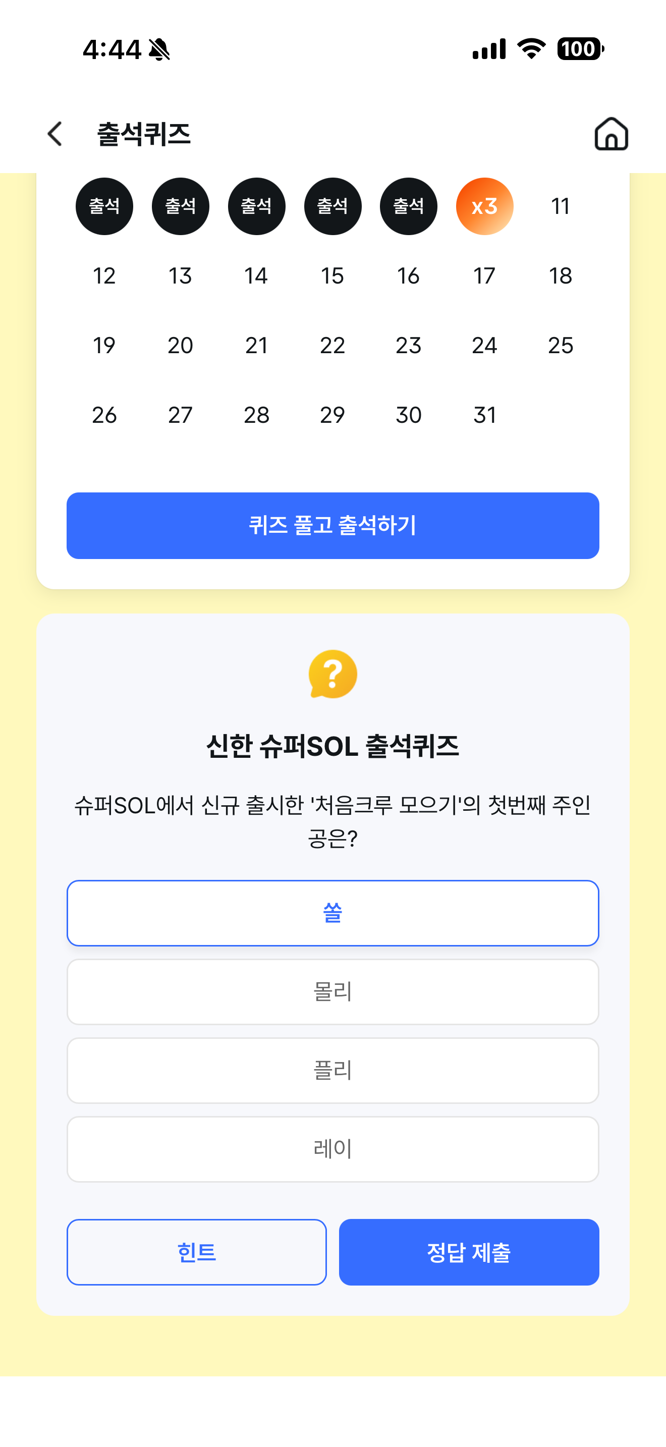 신한 슈퍼SOL 출석퀴즈 정답은 쏠 입니다.