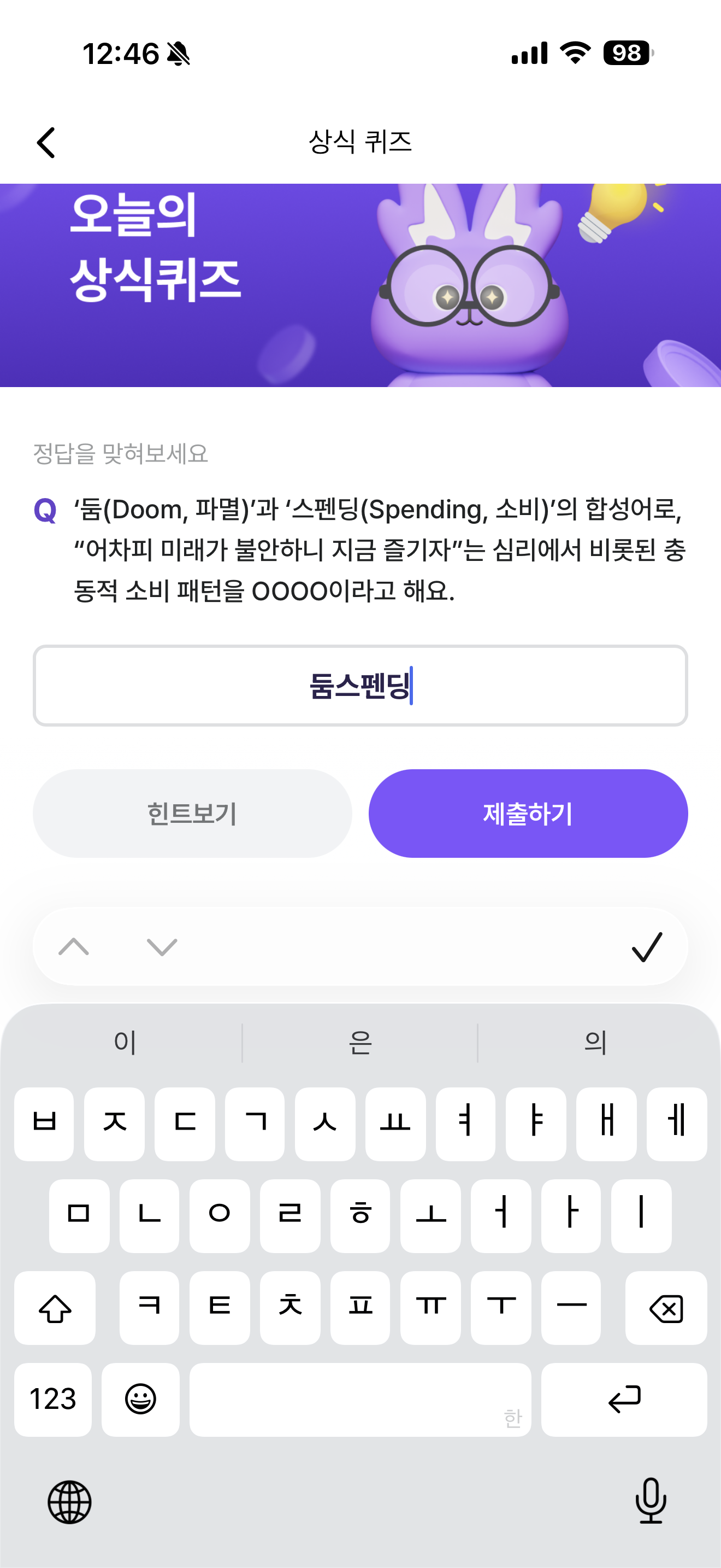 둠(Doom, 파멸)'과 '스펜딩(Spending, 소비)'의 합성어로, "어차피 미래가 불안하니 지금 즐기자"는 심리에서 비롯된 충동적 소비 패턴을 OOOO이라고 해요. 주관식 퀴즈인데요.