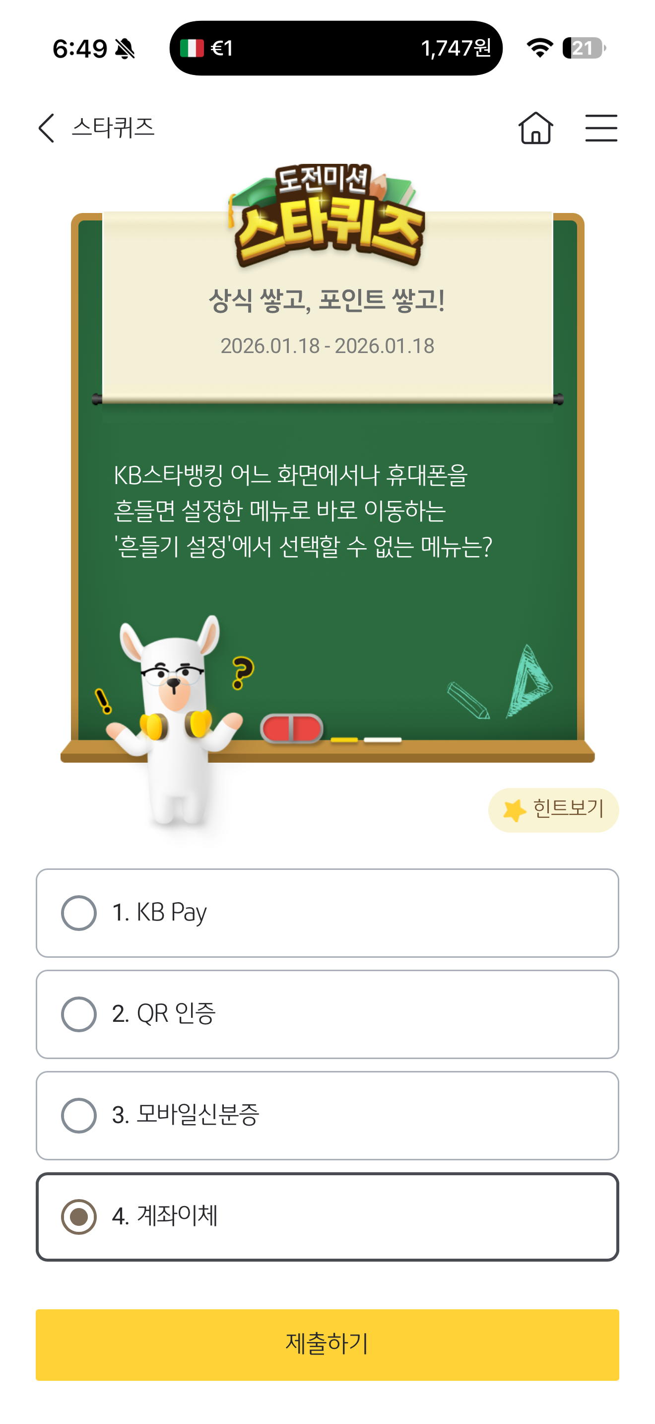 KB스타뱅킹 스타퀴즈 1월 18일 문제입니다