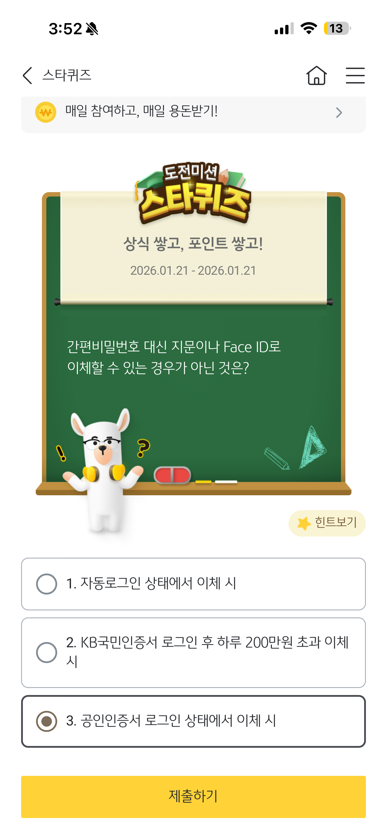 KB스타뱅킹 스타퀴즈 정답은 공인인증서 로그인 상태에서 이체 시 입니다