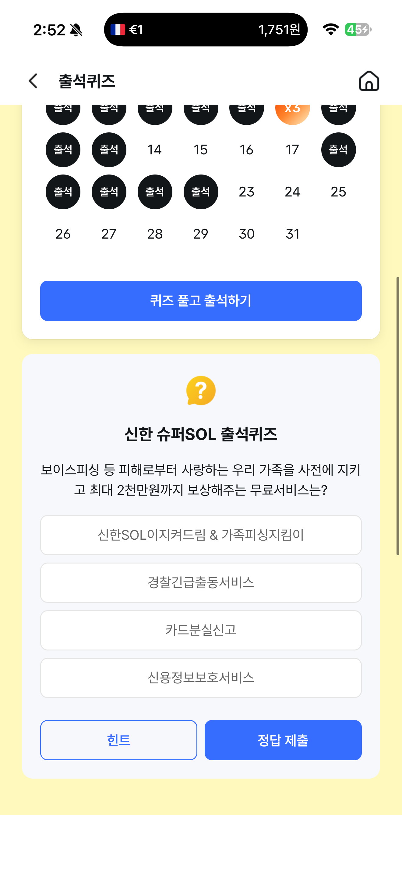 신한 슈퍼SOL 출석퀴즈 정답은 신한SOL 이지켜드림 & 가족피싱지킴이 입니다