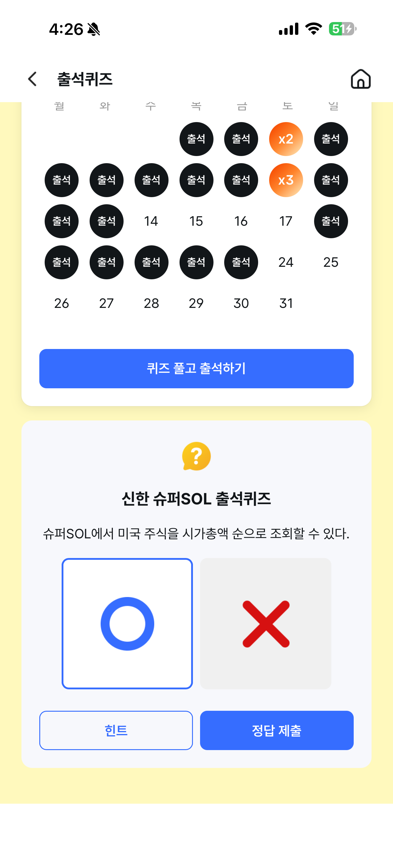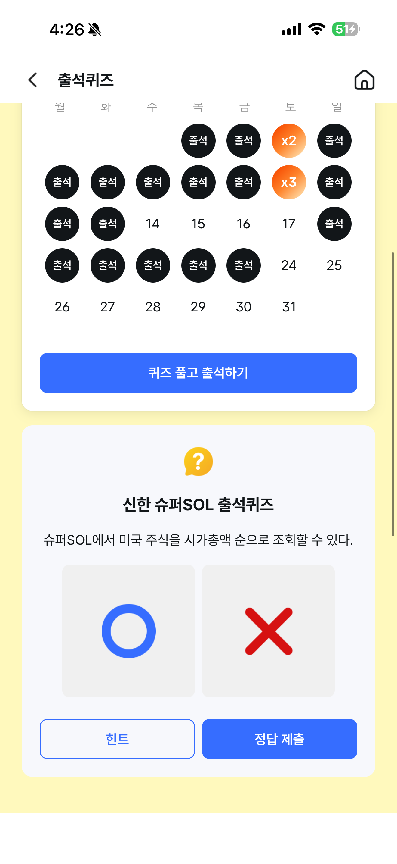 신한 슈퍼SOL 출석퀴즈 정답은 O 입니다