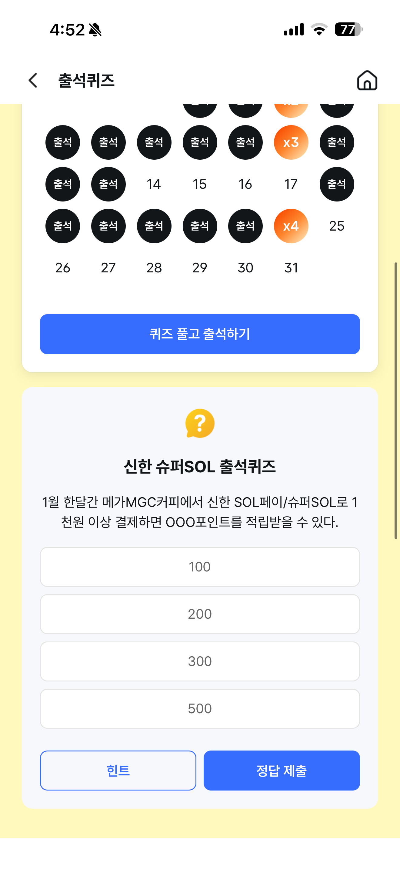 신한 슈퍼SOL 출석퀴즈 정답은 500 입니다