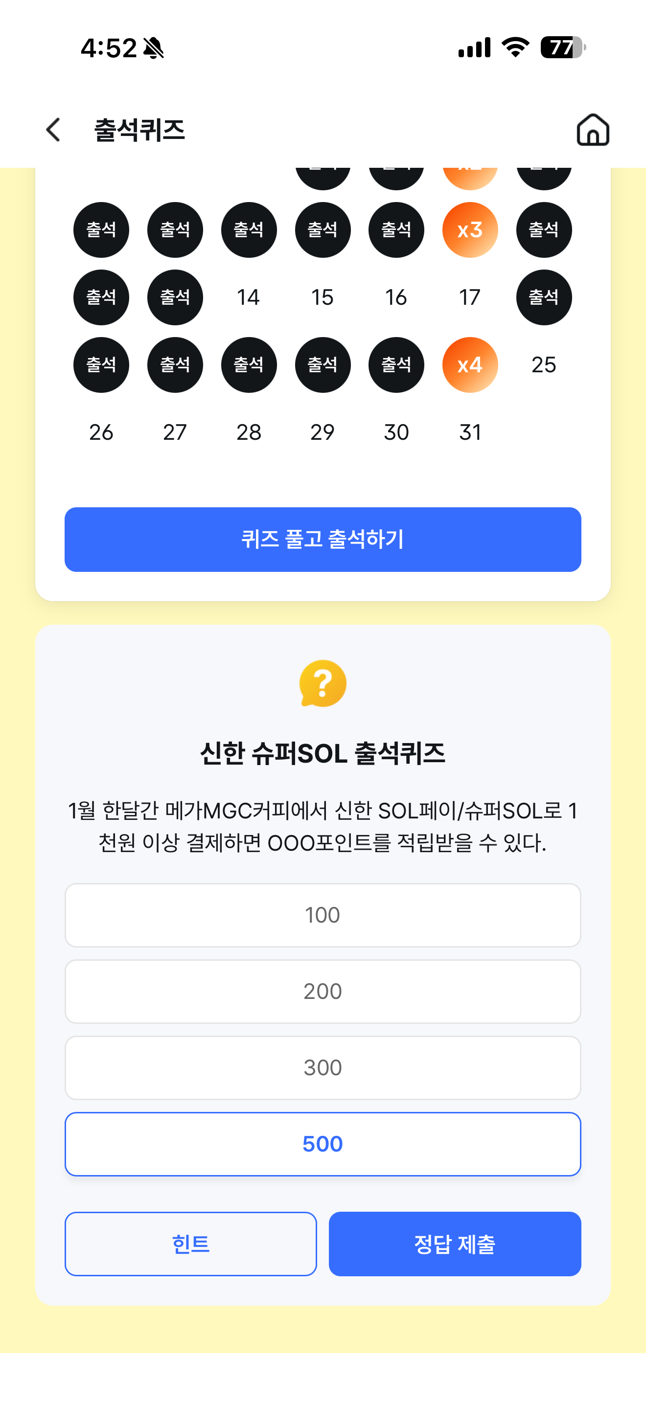 신한 슈퍼SOL 출석퀴즈 정답은 500 입니다