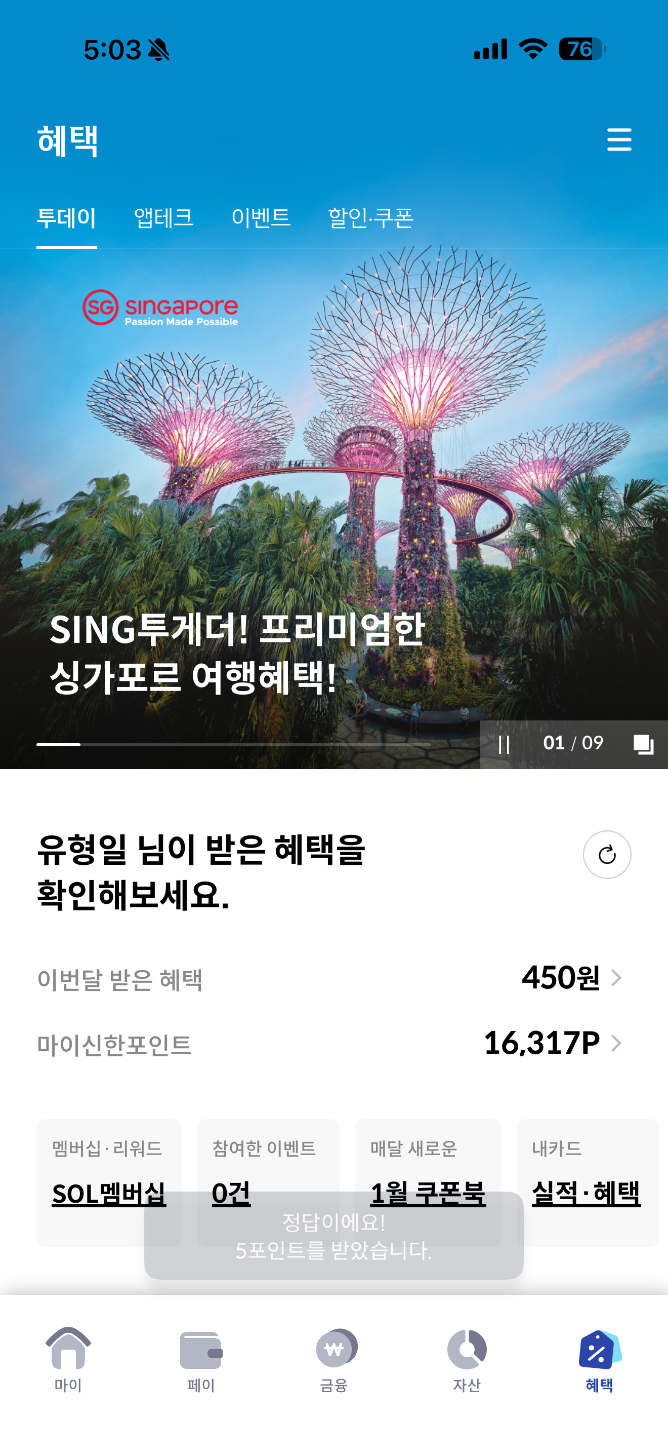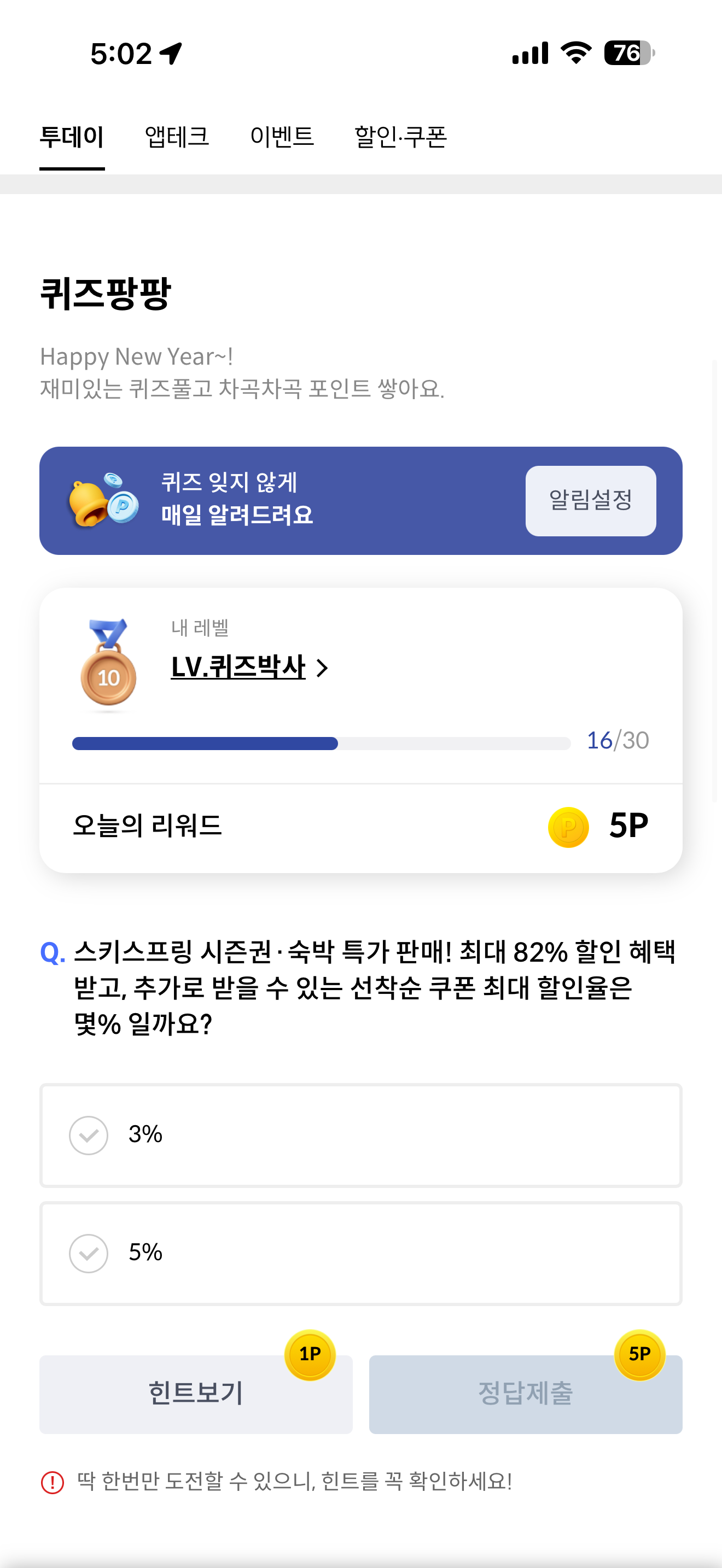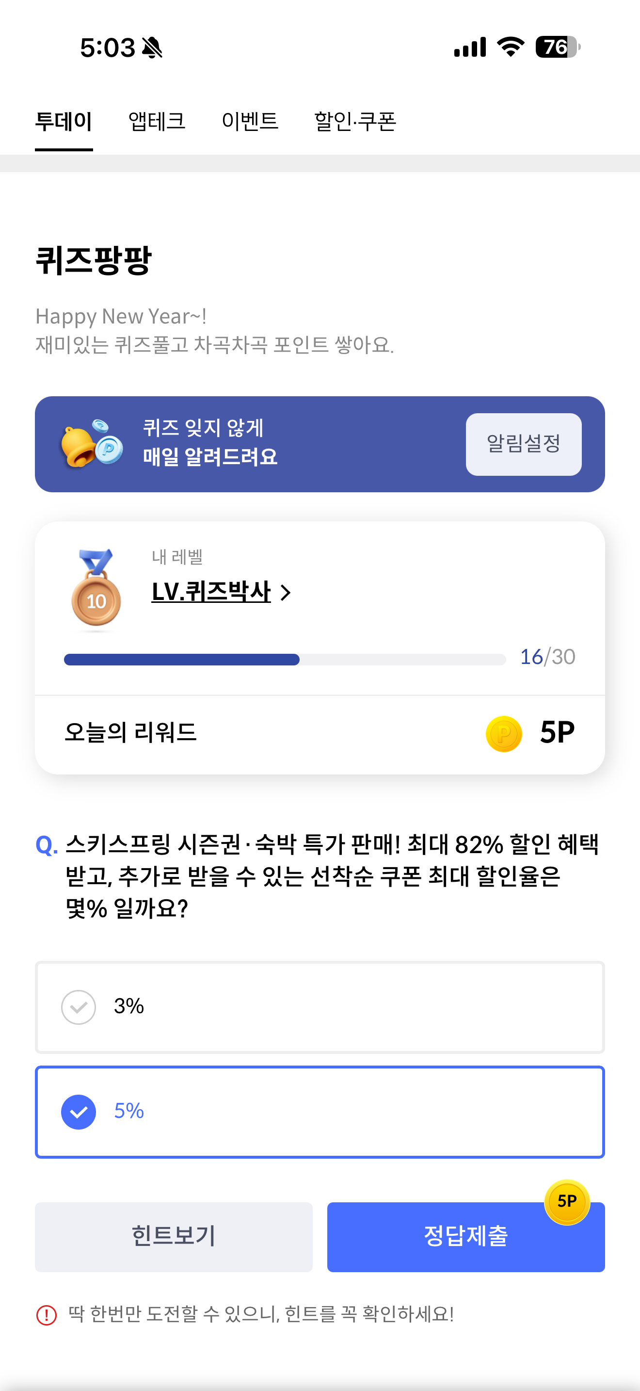 신한카드 퀴즈팡팡 정답은 5% 입니다