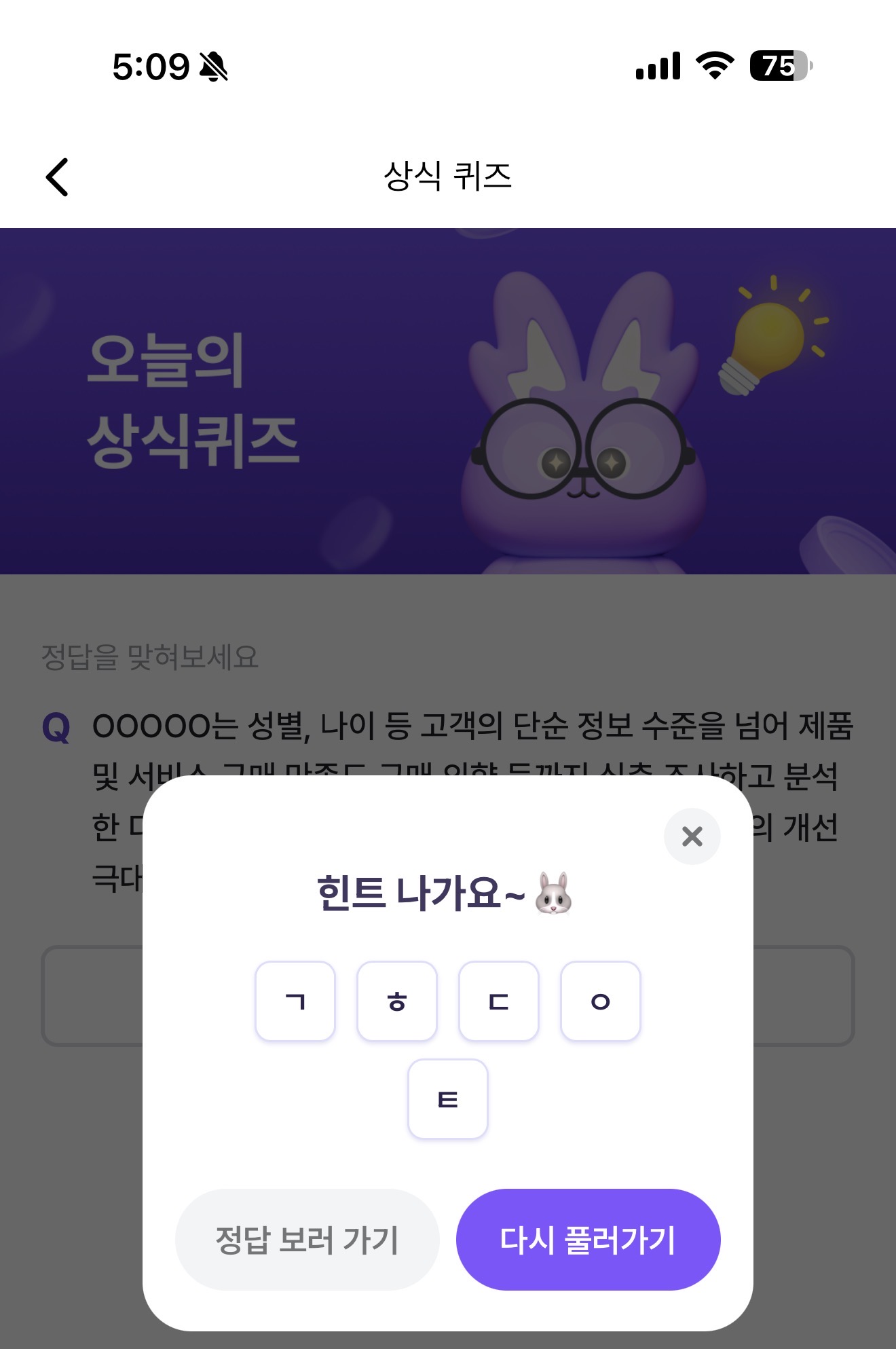 OOOOO는 성별, 나이 등 고객의 단순 정보 수준을 넘어 제품 및 서비스 구매 만족도 구매 의향 등까지 심층 조사하고 분석한 디지털 정보를 말해요. 이를 활용한 제품과 서비스의 개선 극대화로 기업 성장을 이끌고 있어요. 주관식 퀴즈인데요