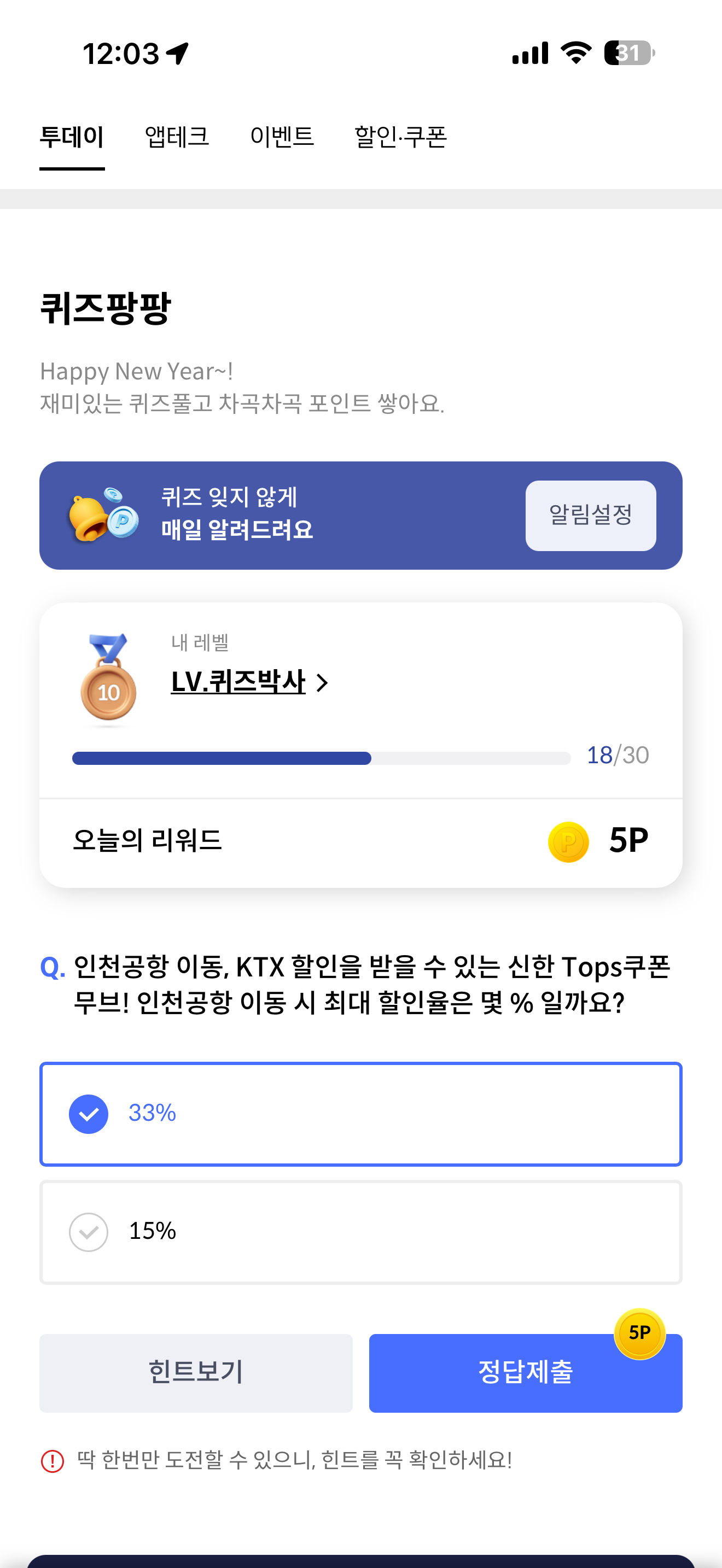 신한카드 퀴즈팡팡 정답은 33% 입니다