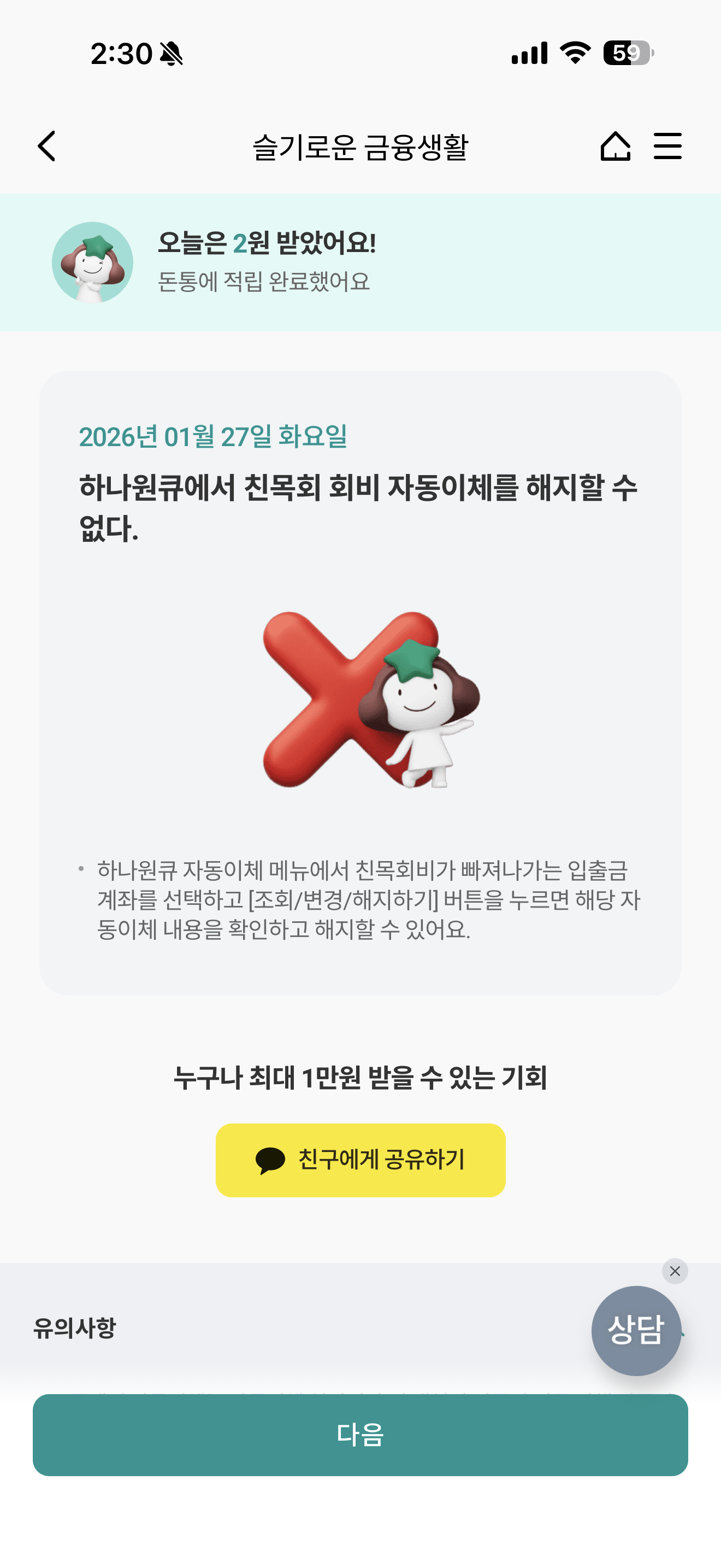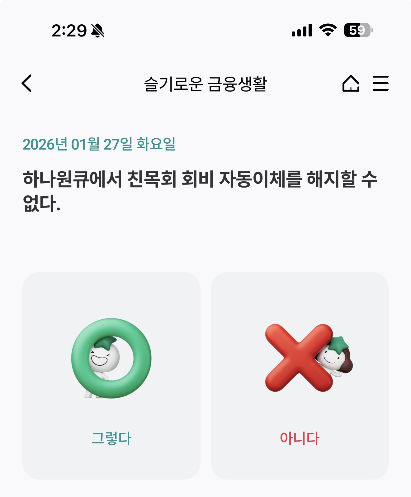 하나원큐 슬기로운 금융생활 OX 퀴즈 1월 27일 정답(하나원큐에서 친목회 회비 자동이체를 해지할 수 없다)