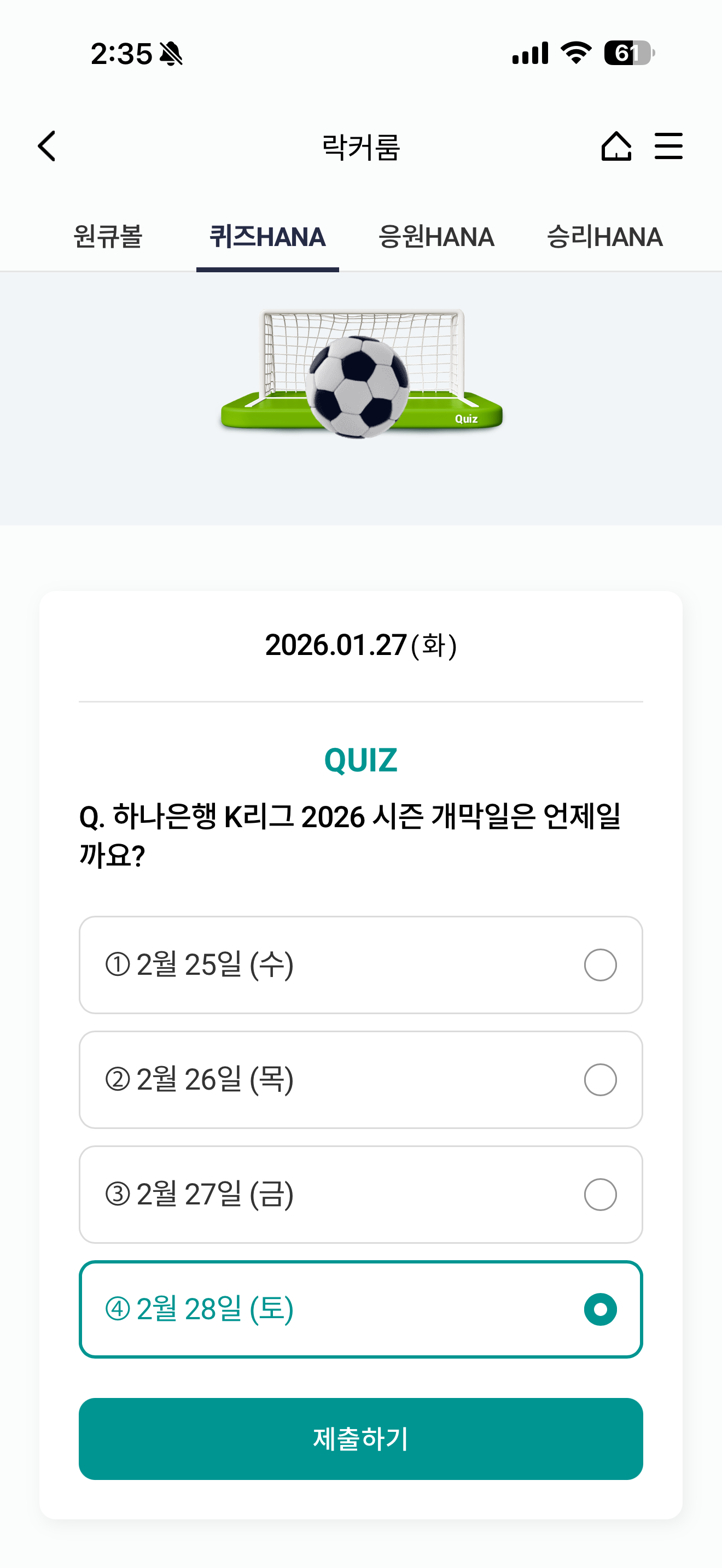 하나원큐 축구 Play 퀴즈 HANA 정답은 2월 28일 (토) 입니다