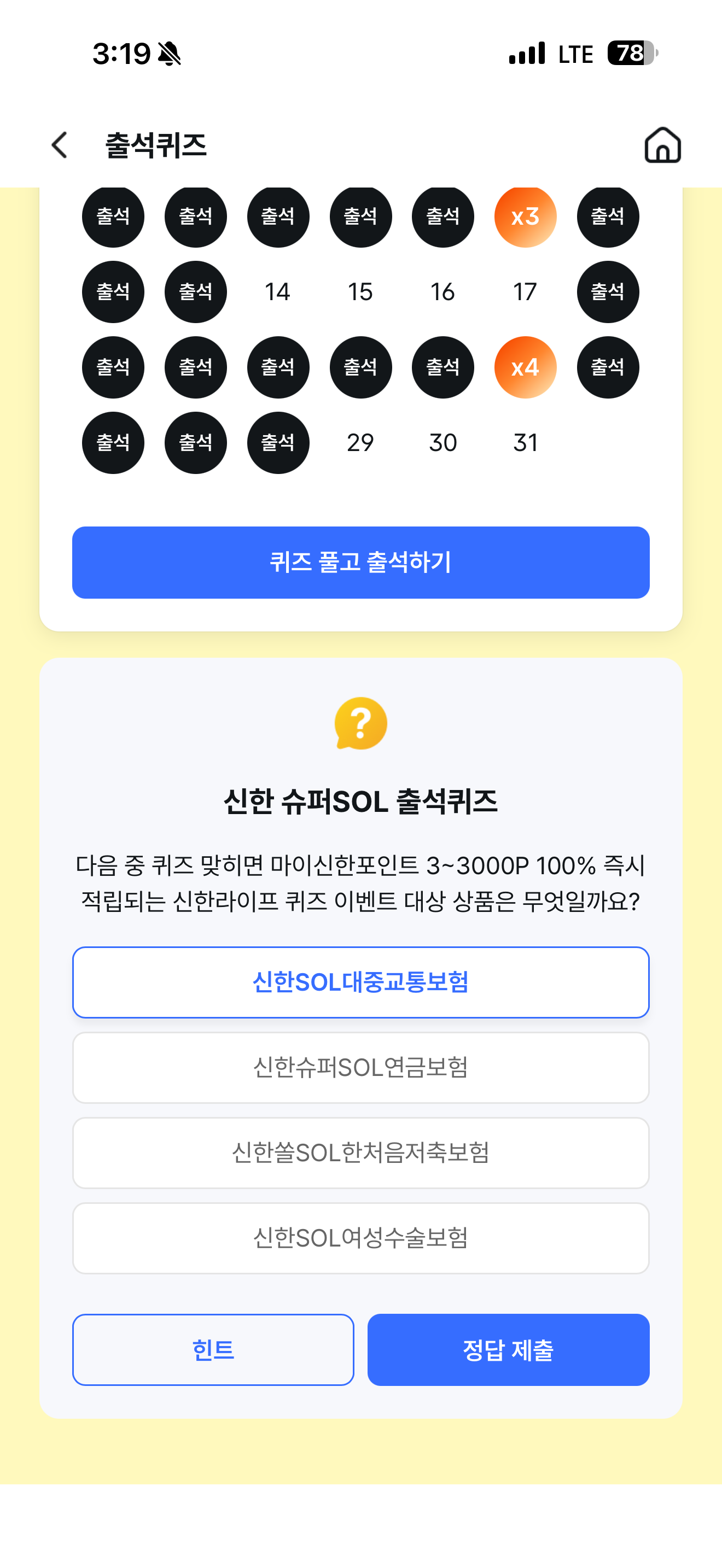 신한 슈퍼SOL 출석퀴즈 정답은 신한SOL대중교통보험 입니다