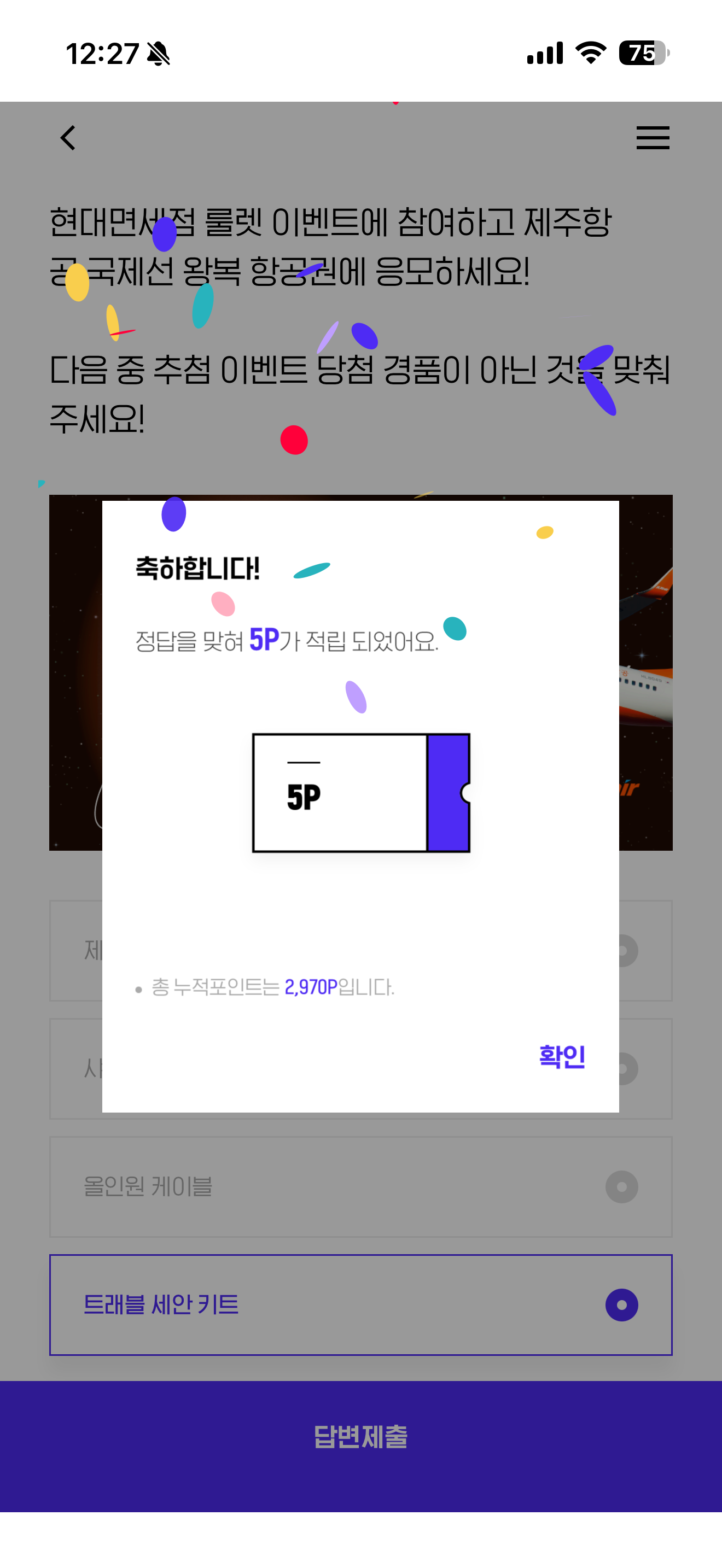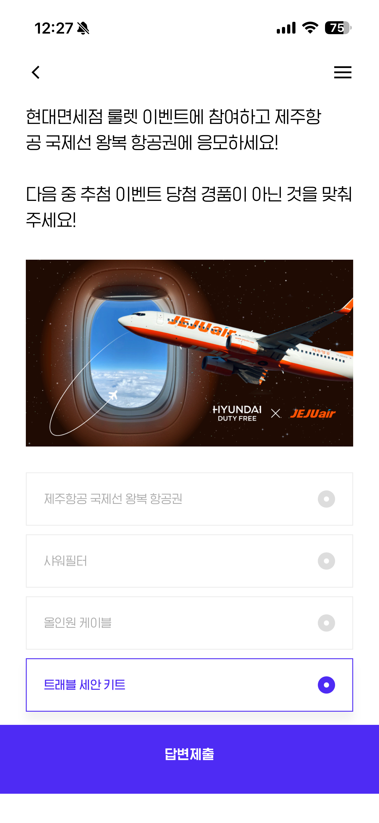현대면세점 룰렛 이벤트에 참여하고 제주항공 국제선 왕복 항공권에 응모하세요! 다음 중 추첨 이벤트 당첨 경품이 아닌 것을 맞춰주세요! 보기는 1. 제주항공 국제선 왕복 항공권 2. 샤워필터 3. 올인원 케이블 4. 트래블 세안 키트 입니다