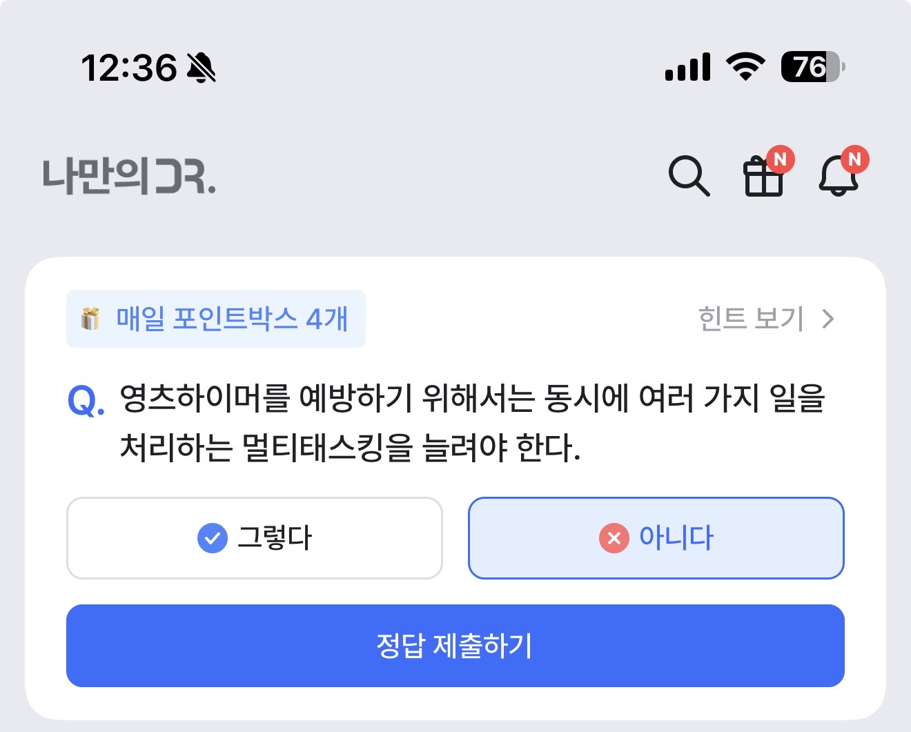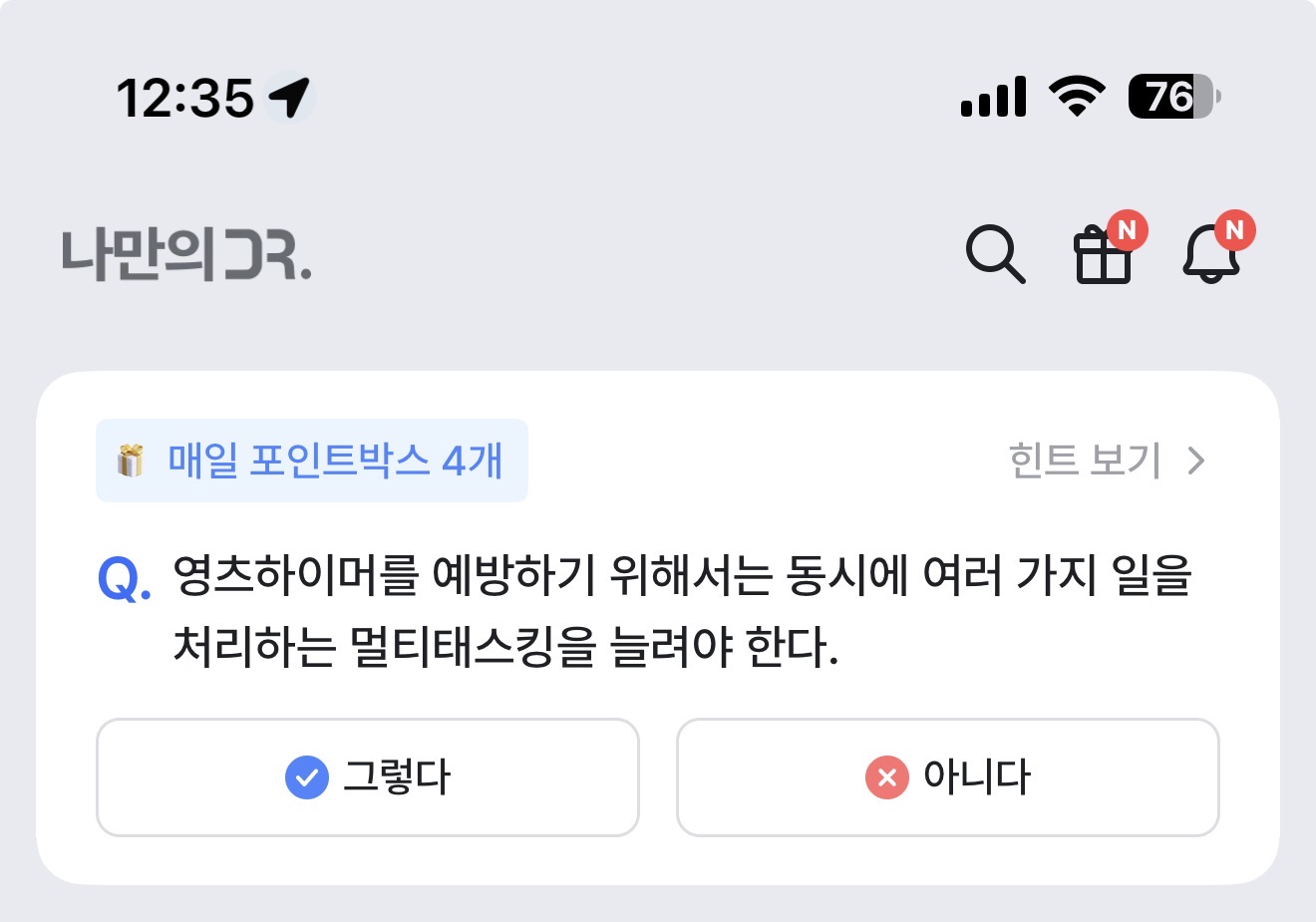 영츠하이머를 예방하기 위해서는 동시에 여러 가지 일을 처리하는 멀티태스킹을 늘려야 한다. 그렇다 아니다 선택하면 되는데요. 영츠하이머가 뭘까요? 요즘 젋은 사람들이 기억을 잃는 일들이 잦아지고 있다는데요. 잘 참고해 두세요