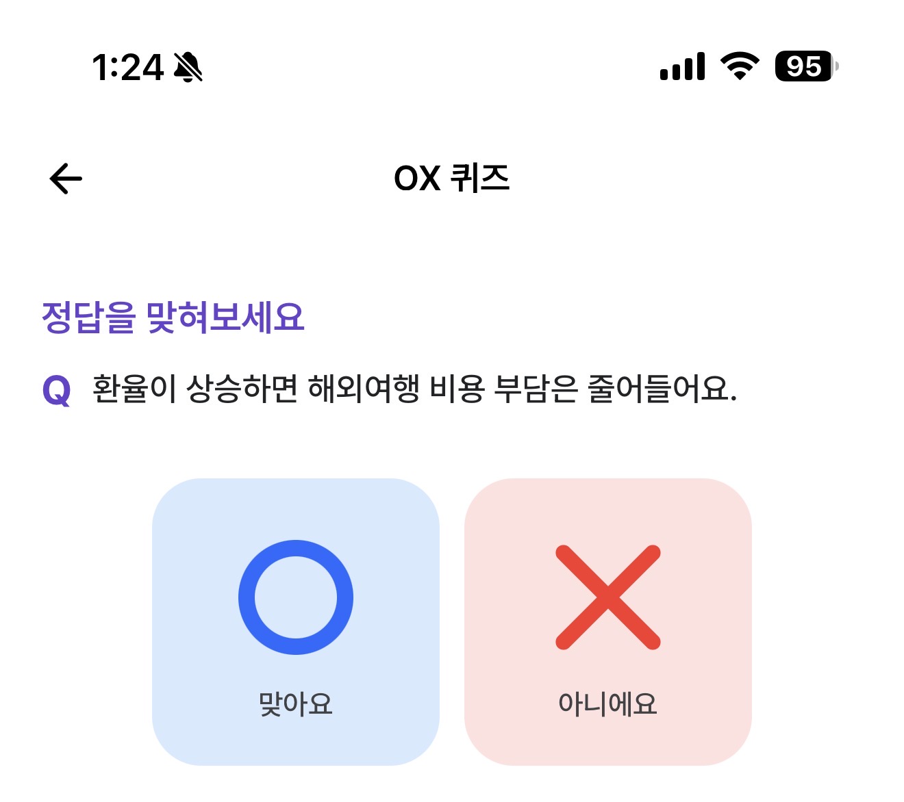 환율이 상승하면 해외여행 비용 부담은 줄어들어요 O, X 퀴즈인데요. 환율이 상승해서 요즘 힘들어하는 분들 많으시죠. 환율이 높으면 여행시 어떨까요? 한국돈의 가치가 떨어진다는 의미라 여행 부담이 크게 증가합니다.