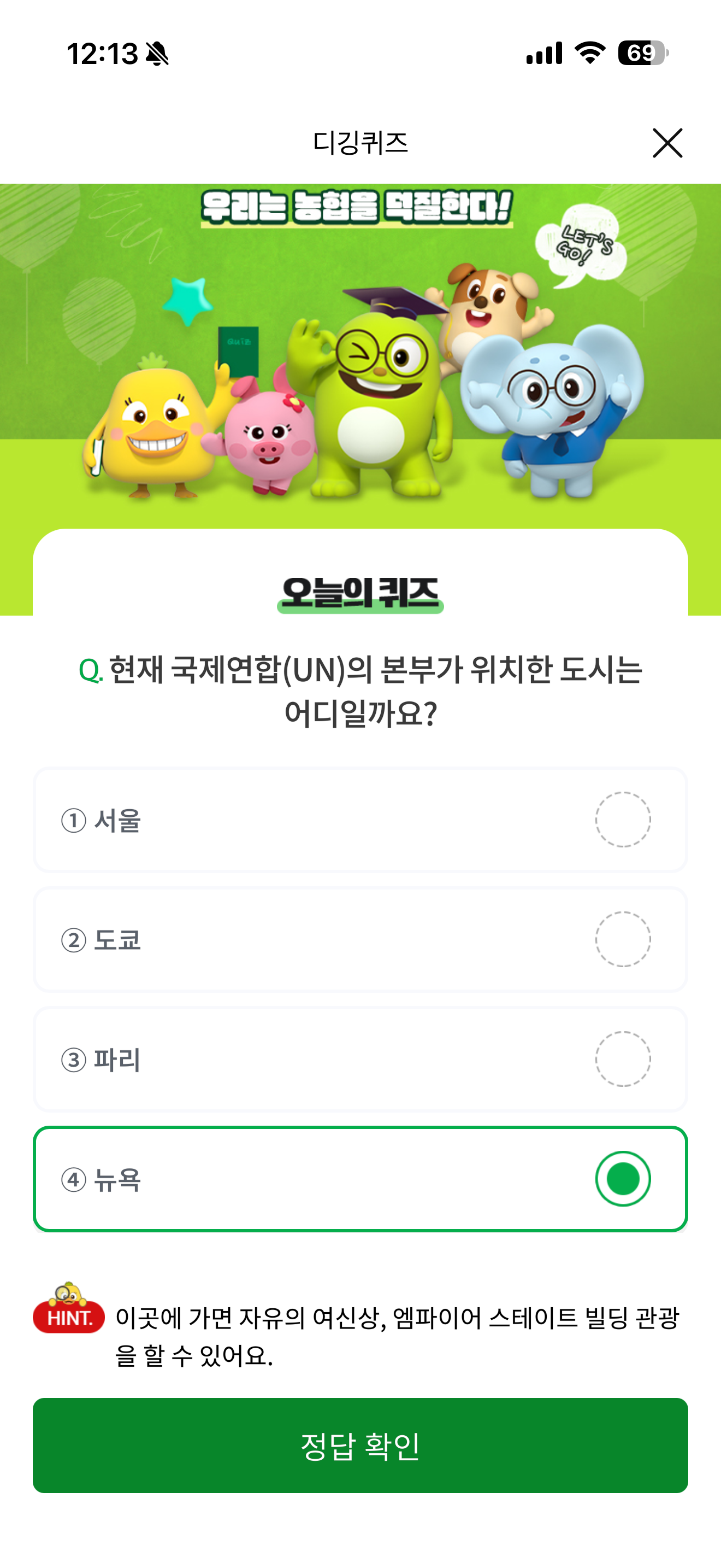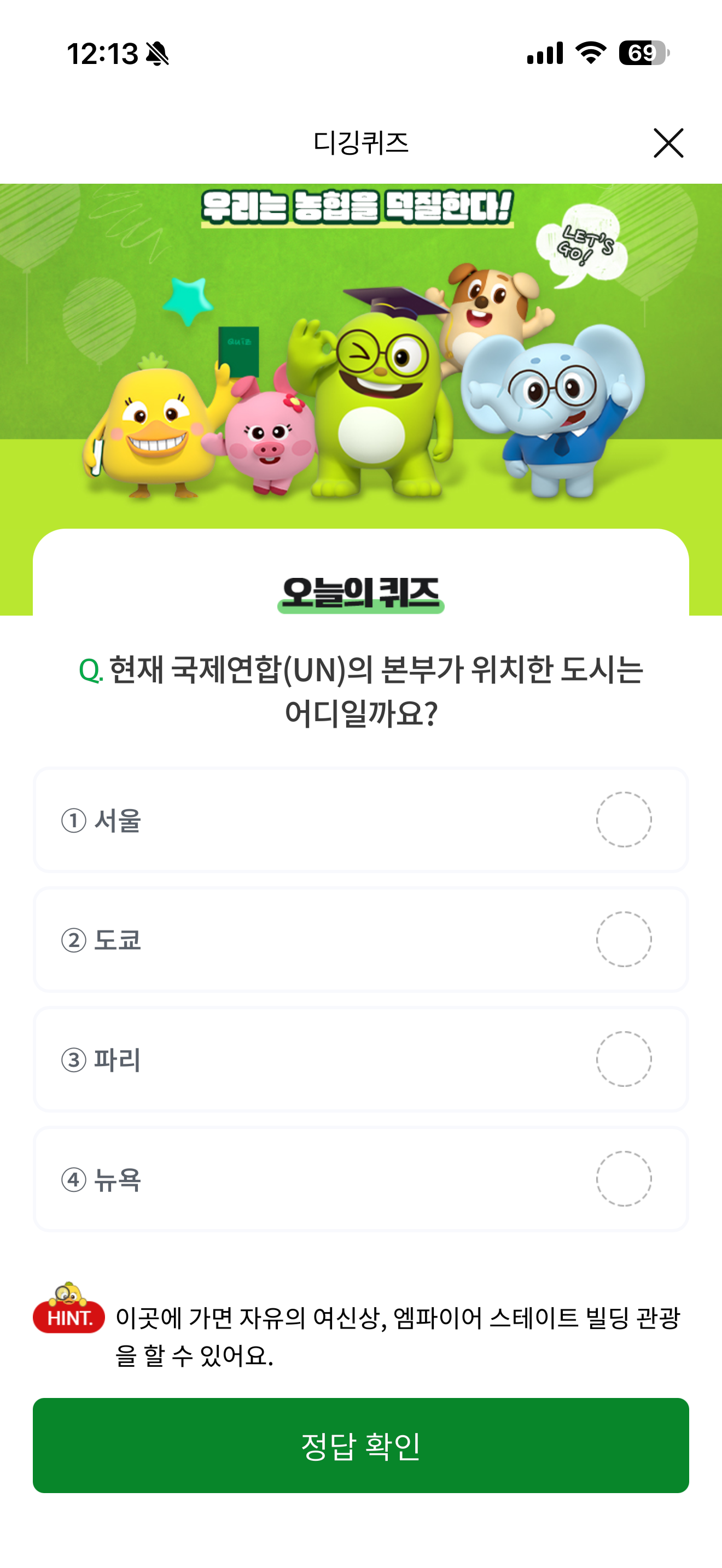 NH올원뱅크 디깅퀴즈 2월 2일 정답(현재 국제연합(UN)의 본부가 위치한 도시는 어디일까요?)