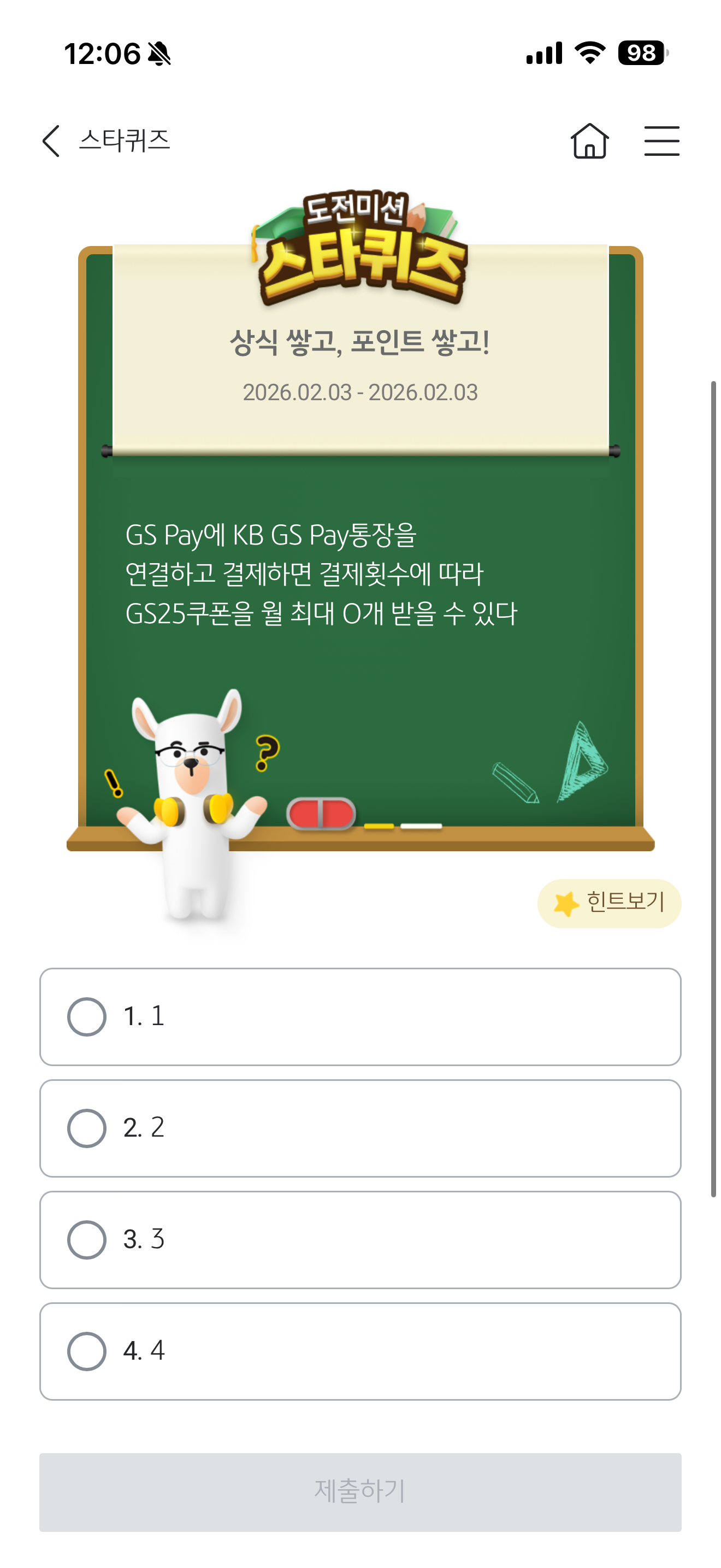 GS Pay에 KB GS Pay통장을 연결하고 결제하면 결제횟수에 따라 GS25쿠폰을 월 최대 O개 받을 수 있다 보기는 1. 1 2. 2 3. 3 4. 4 입니다. GS Pay와 KB가 제휴를 통해 혜택을 제공하는 것인데요. GS25 이용할때 활용해 보세요