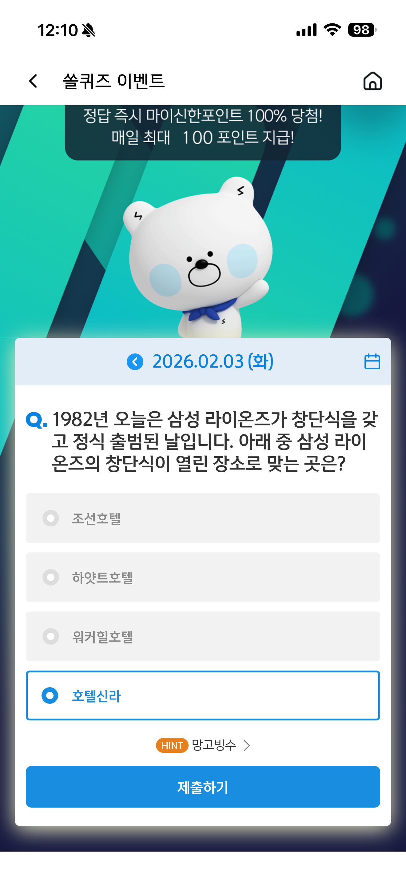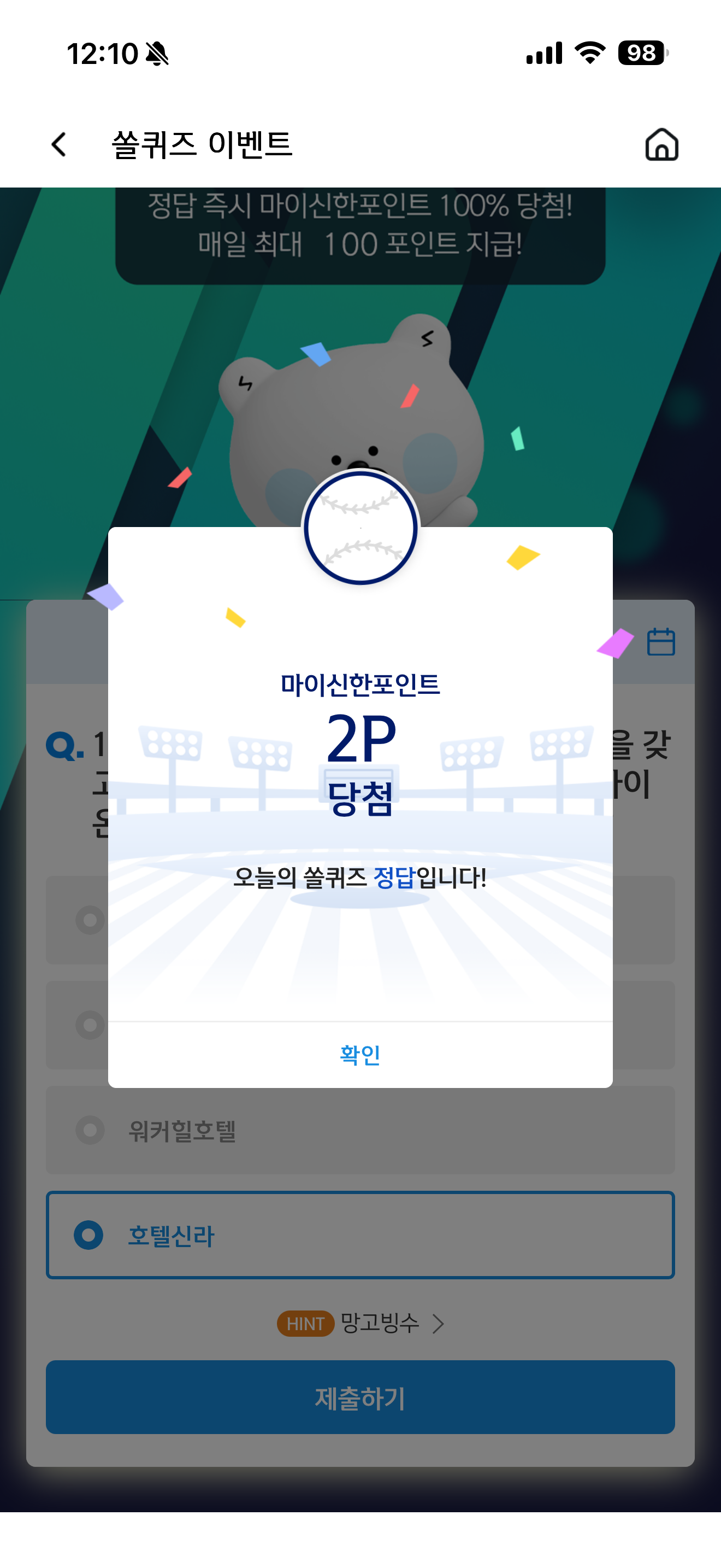 신한 슈퍼SOL 야구/상식 쏠퀴즈 정답은 호텔신라 입니다