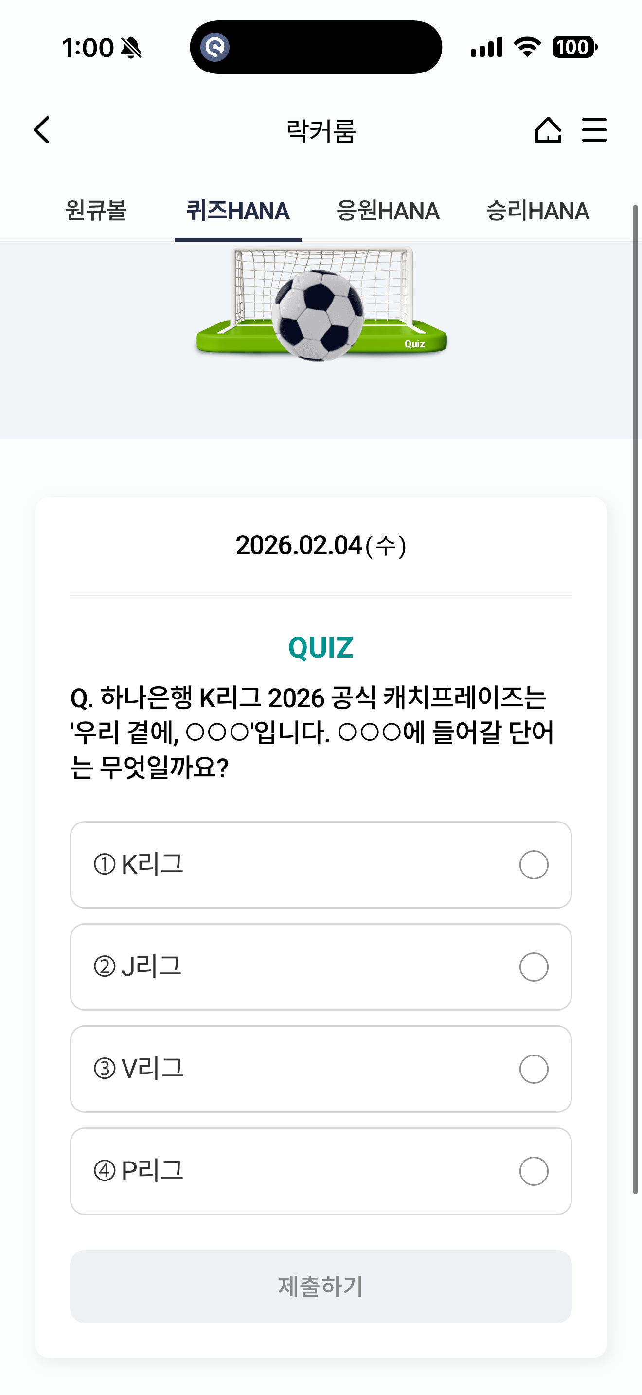 하나은행 K리그 2026 공식 캐치프레이즈는 '우리 곁에, OOO'입니다. OOO에 들어갈 단어는 무엇일까요? 보기는 1. K리그 2. J리그 3. V리그 4. P리그 입니다. 하나은행 K리그 공식이니 이미 답이 보이죠.