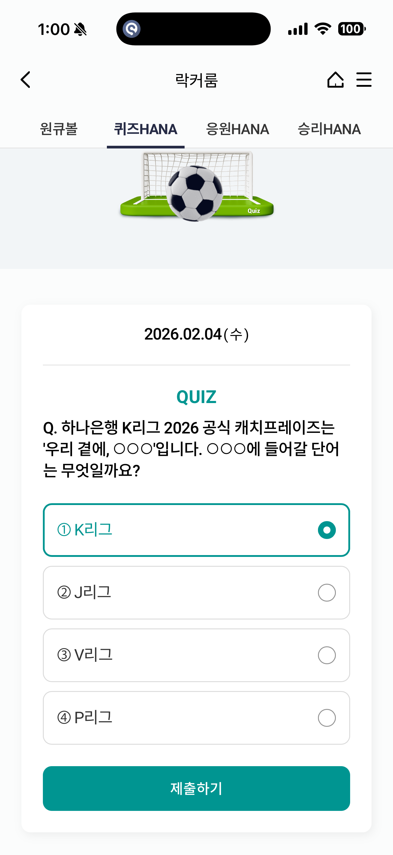 하나은행 K리그 2026 공식 캐치프레이즈는 '우리 곁에, OOO'입니다. OOO에 들어갈 단어는 무엇일까요? 보기는 1. K리그 2. J리그 3. V리그 4. P리그 입니다. 하나은행 K리그 공식이니 이미 답이 보이죠.