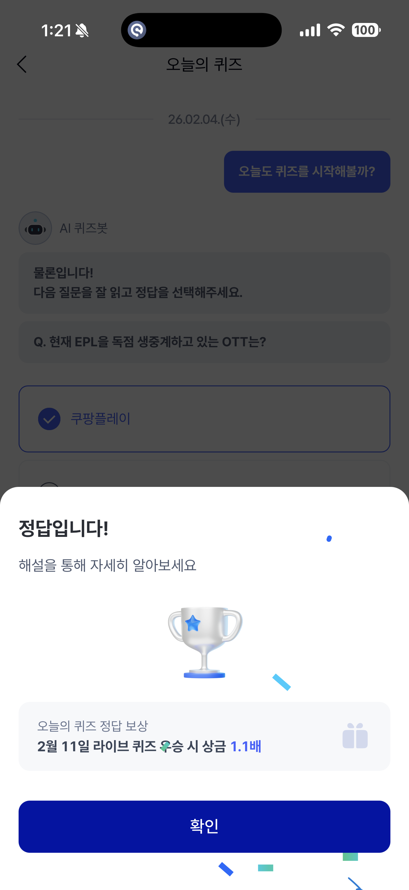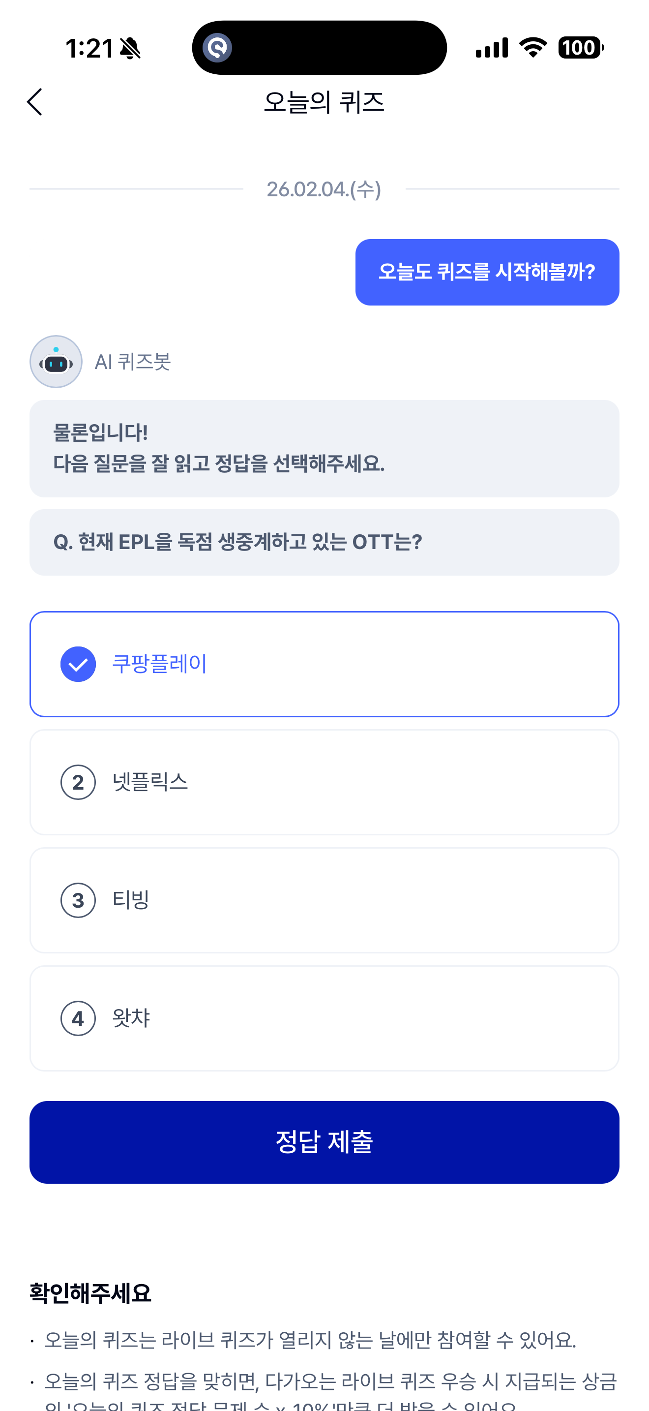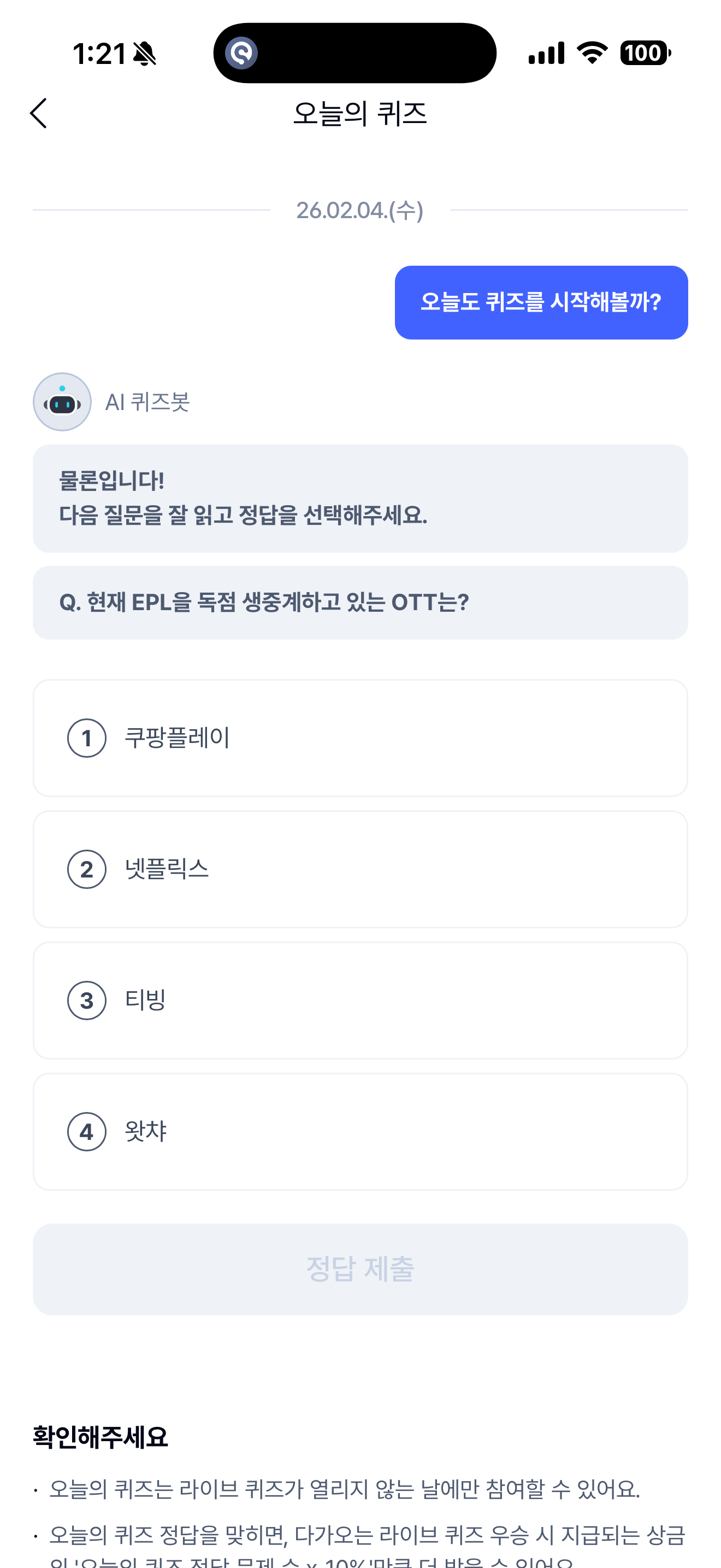케이뱅크 AI퀴즈 챌린지 2월 4일 정답(현재 EPL을 독점 생중계하고 있는 OTT는?)