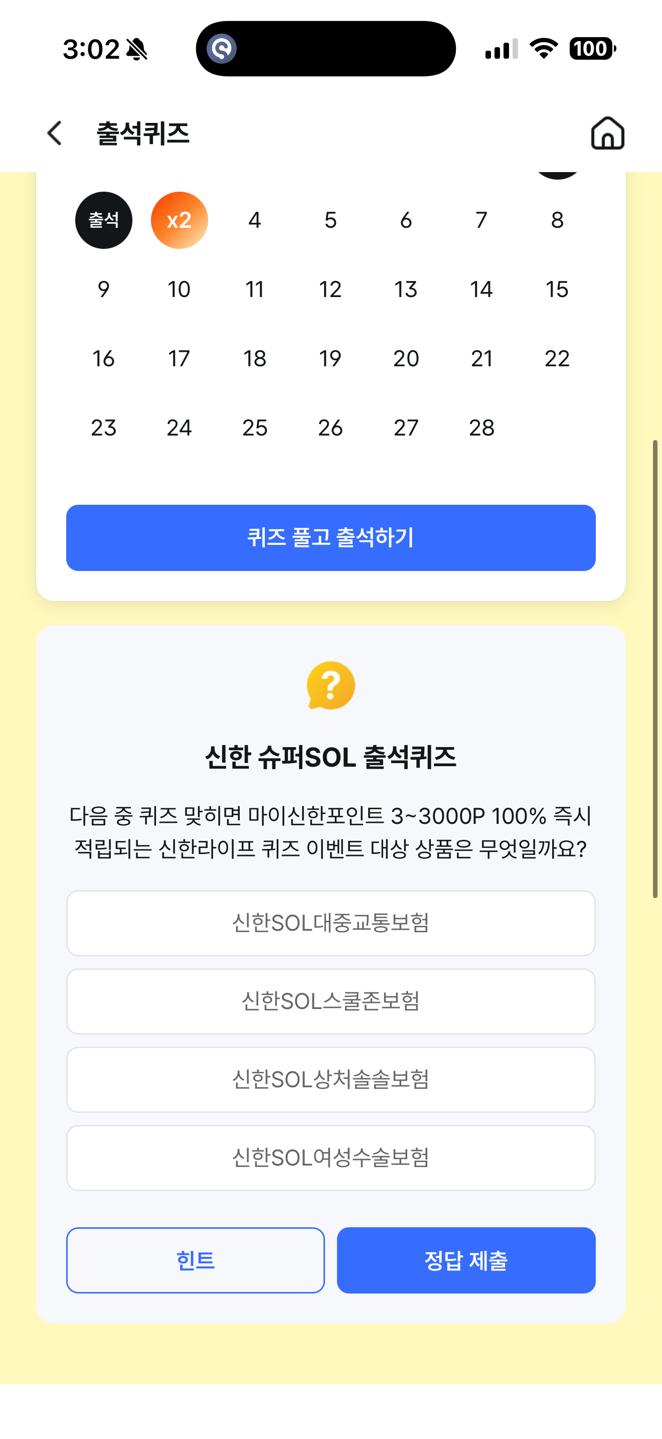 신한 슈퍼SOL 출석퀴즈 정답은 신한SOL대중교통보험 입니다