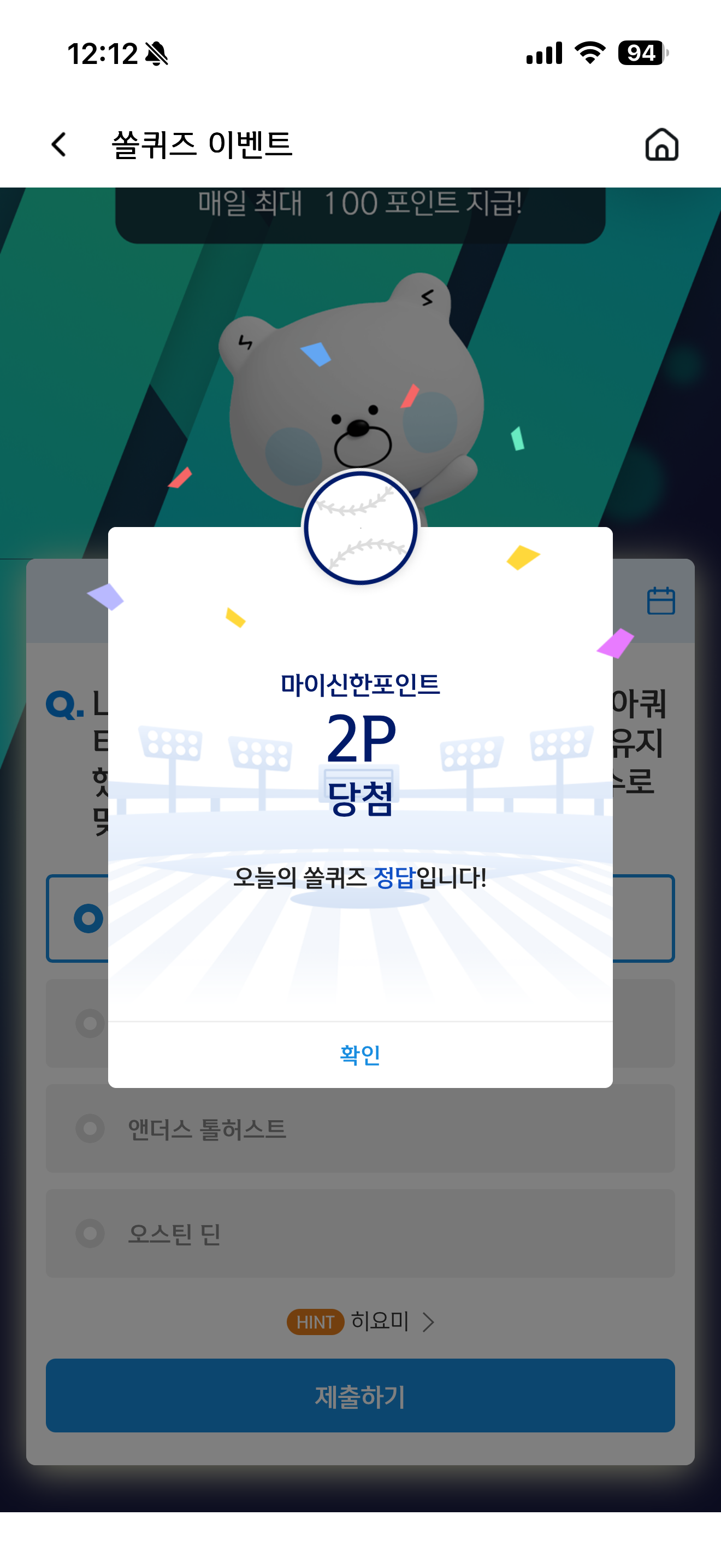 신한 슈퍼SOL 야구/상식 쏠퀴즈 2월 5일 문제입니다
