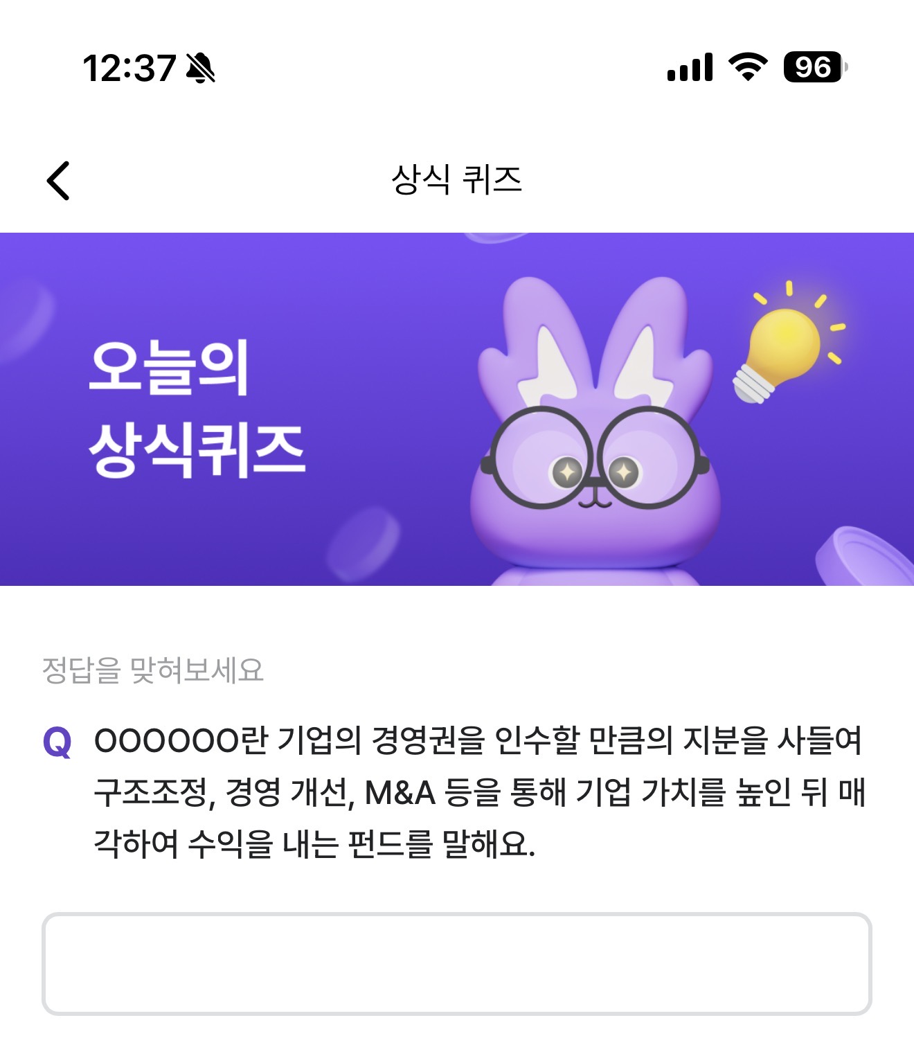 OOOOOO란 기업의 경영권을 인수할 만큼의 지분을 사들여 구조조정, 경영 개선, M&A 등을 통해 기업 가치를 높인 뒤 매각하여 수익을 내는 펀드를 말해요. 주관식 퀴즈인데요.