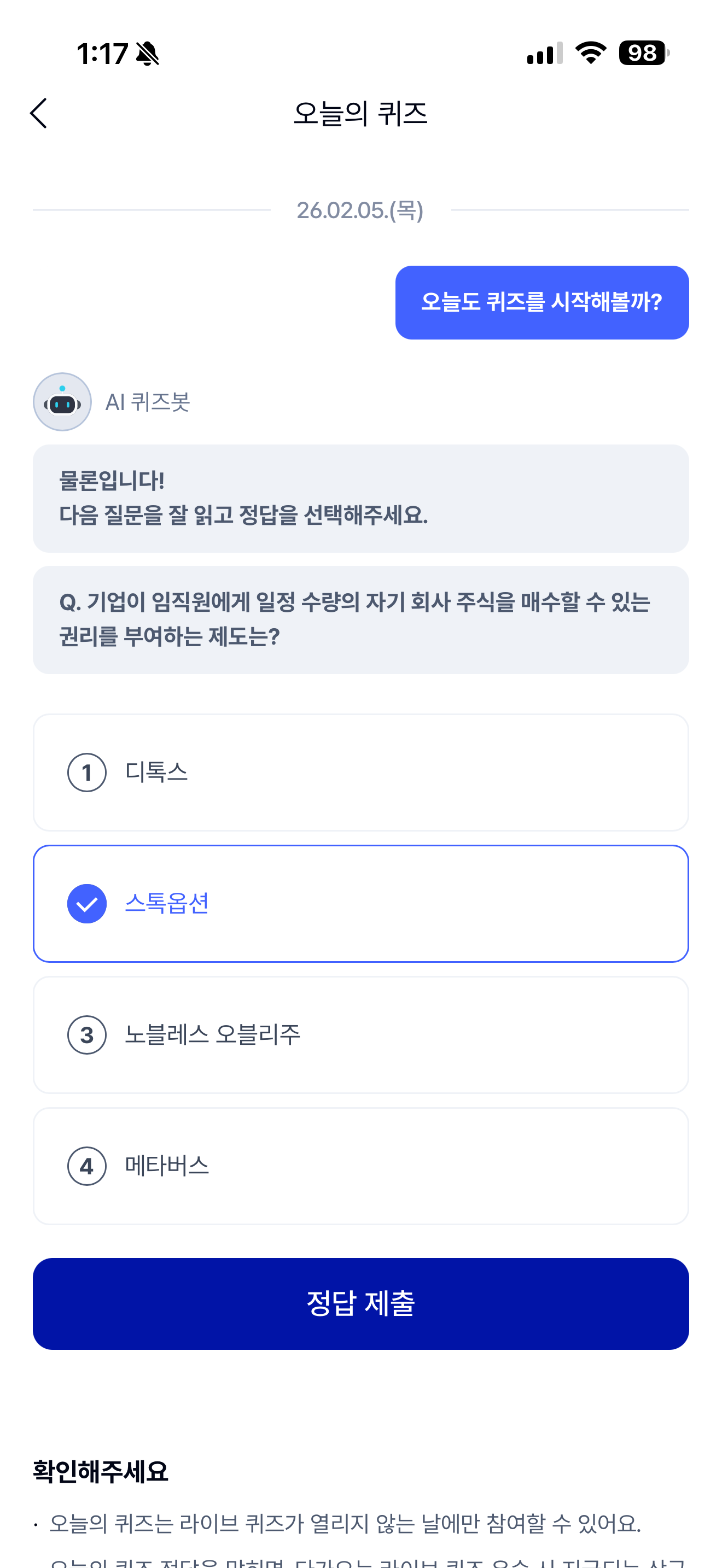 케이뱅크 AI퀴즈 챌린지 정답은 스톡옵션 입니다
