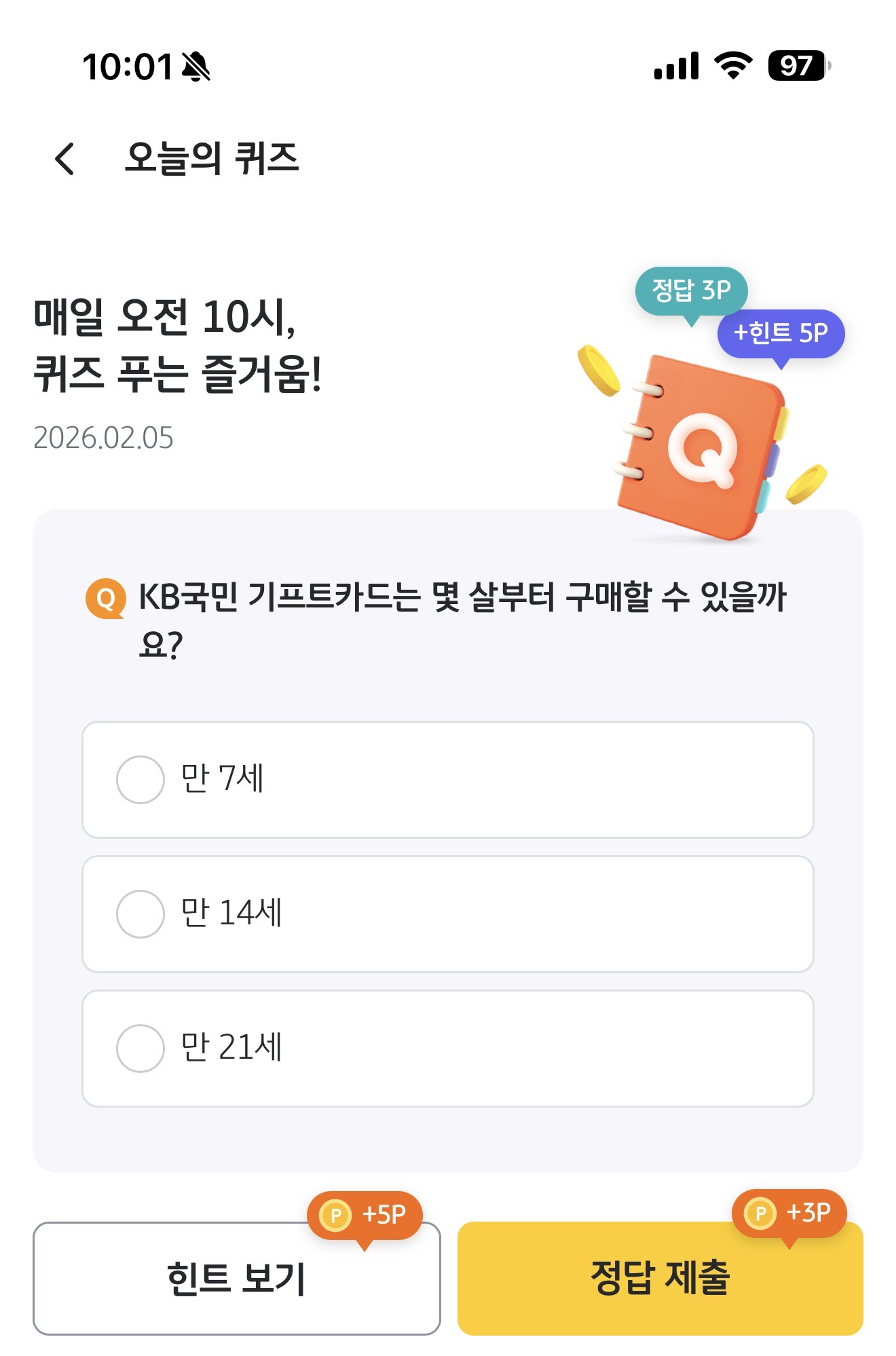 KB Pay 오늘의 퀴즈 정답은 만 14세 입니다